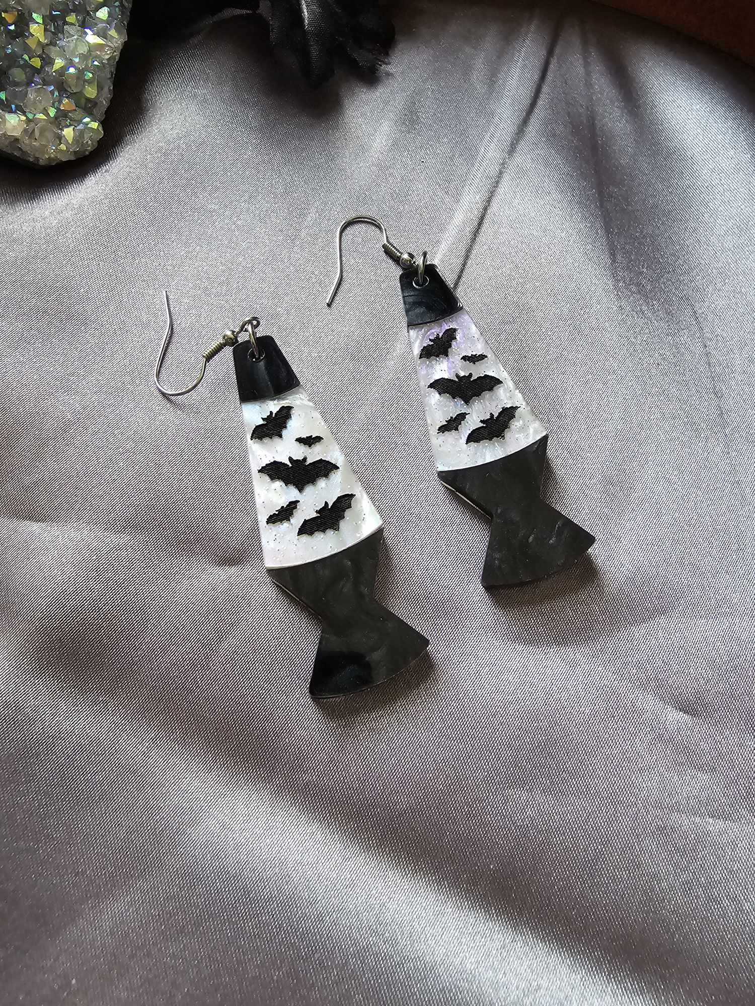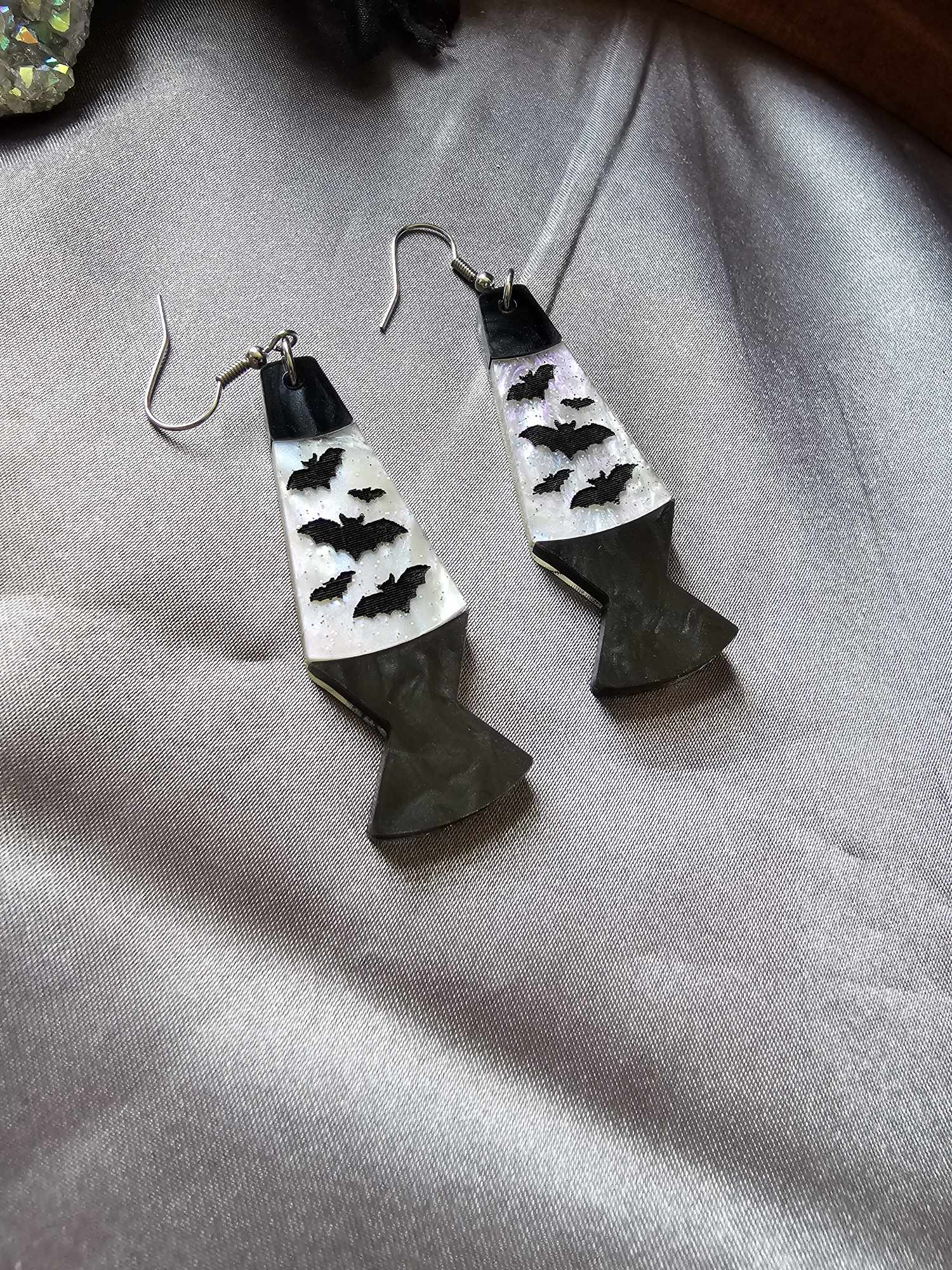 A white and lavender shimmer acrylic with engraved and hand painted bats & a black marble base.