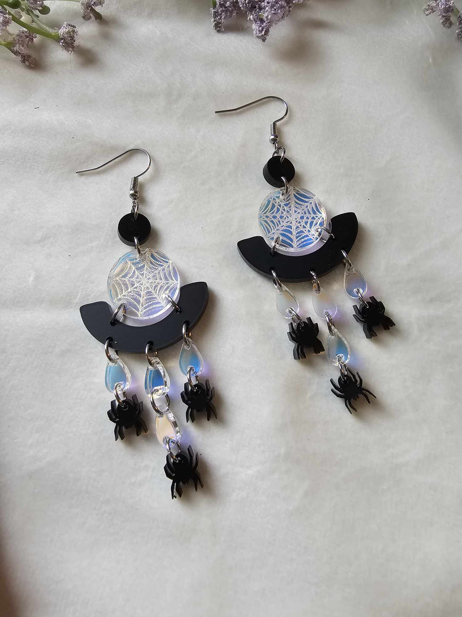 A mixture of iridescent and matte black acrylic black widow drops. These do hang a bit longer than my usual earrings, but the pieces are small so they are still light weight!