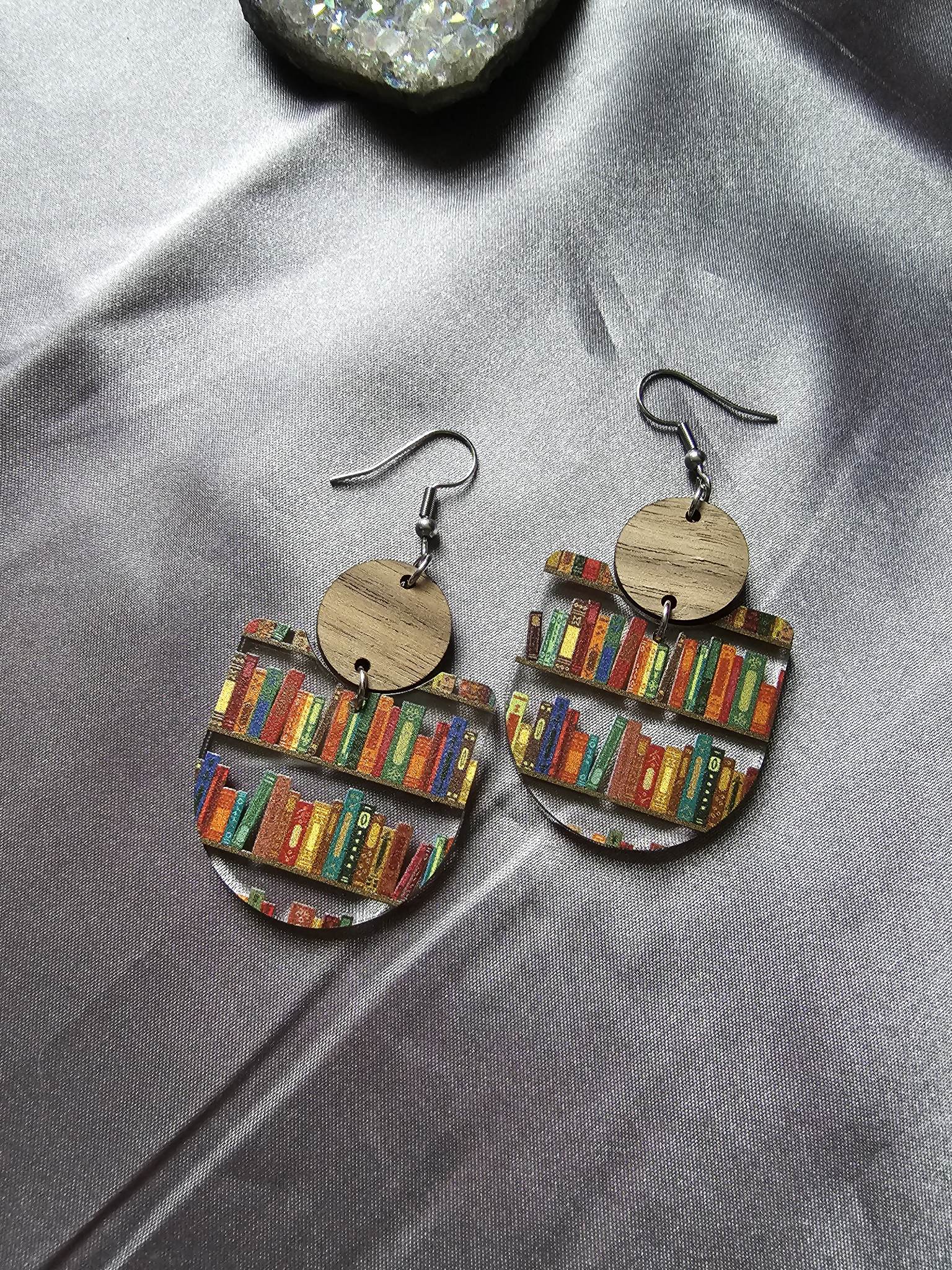 A cute, fun pair of bookshelf printed acrylic earrings with walnut wood.