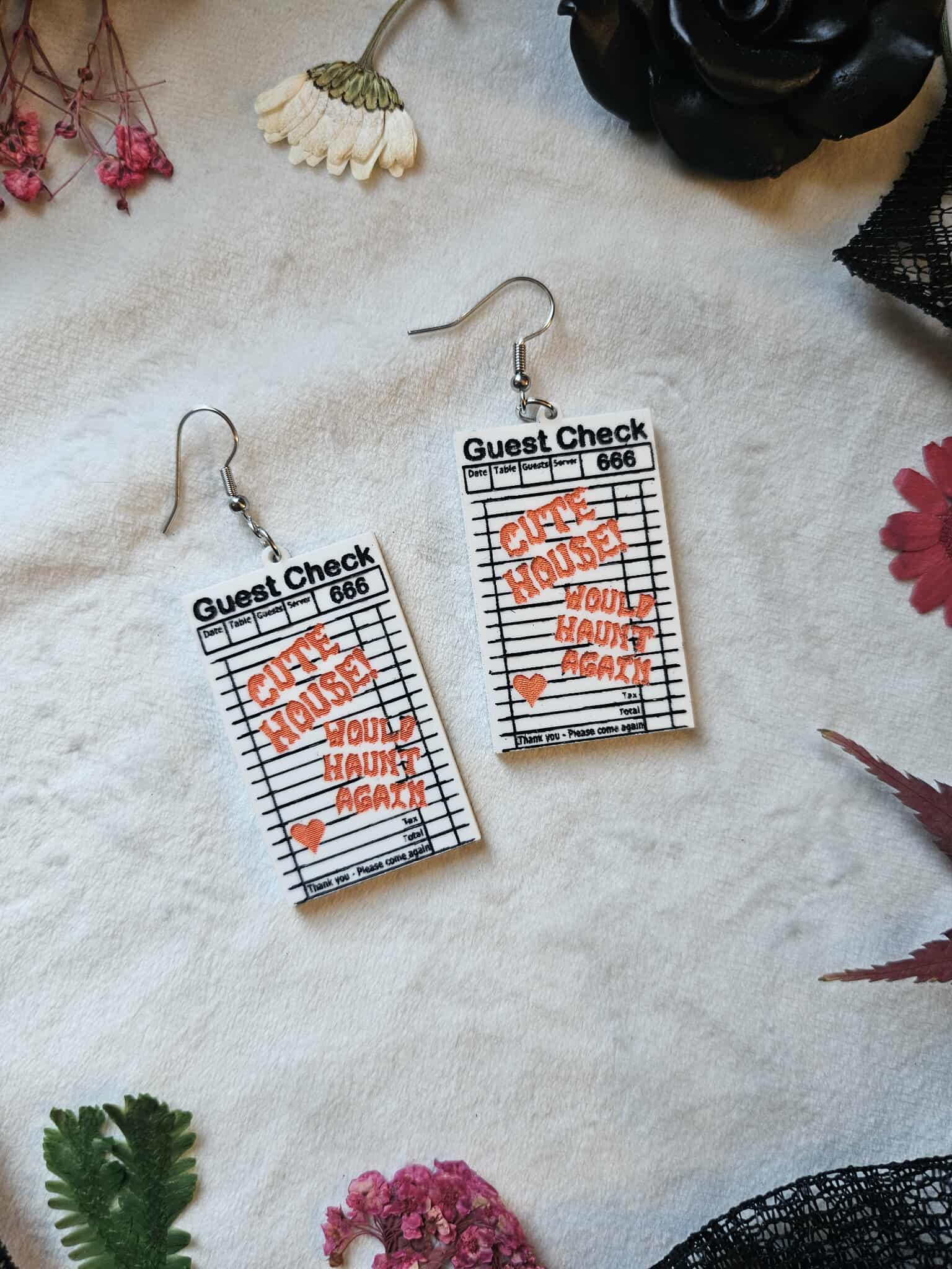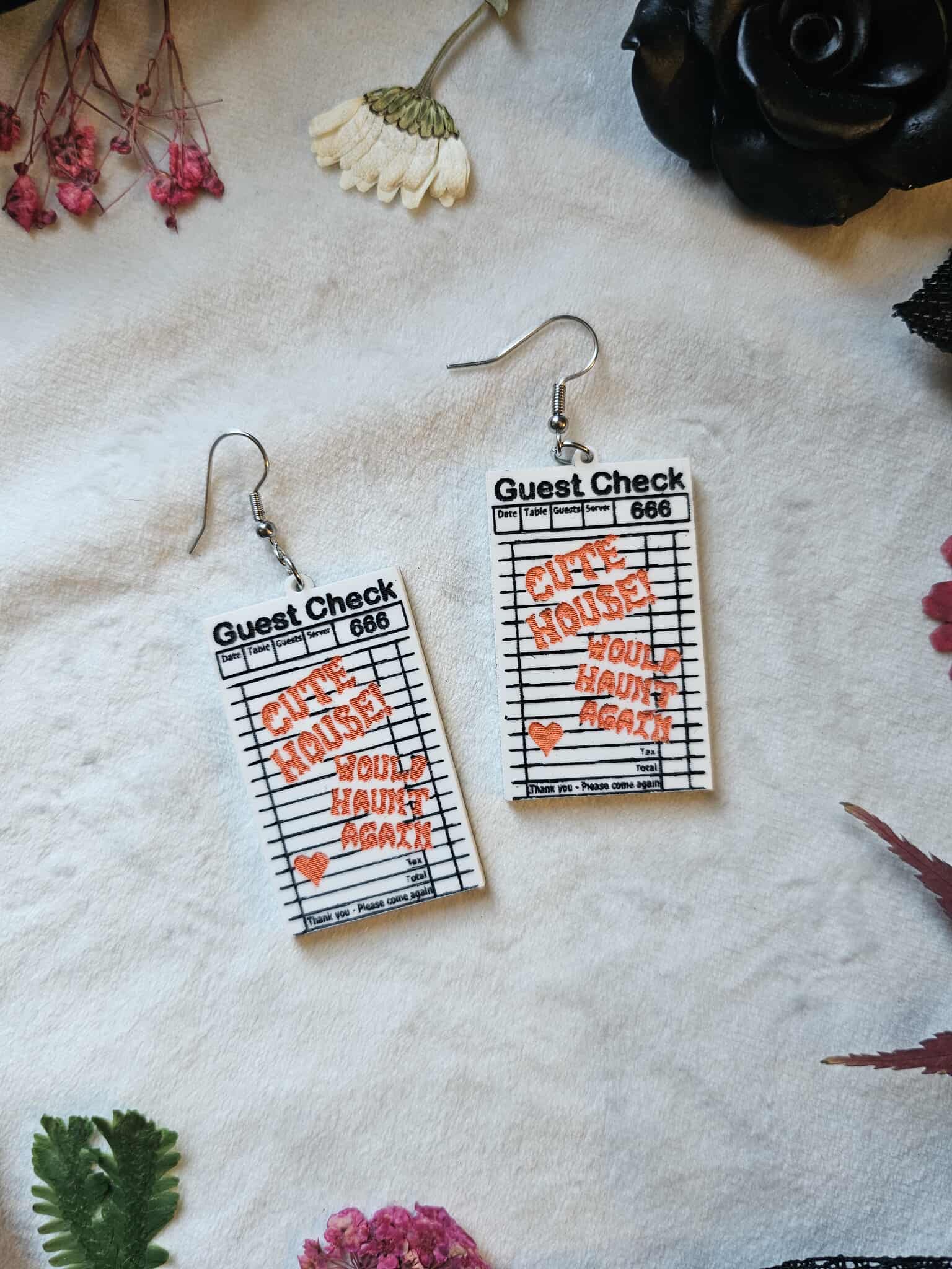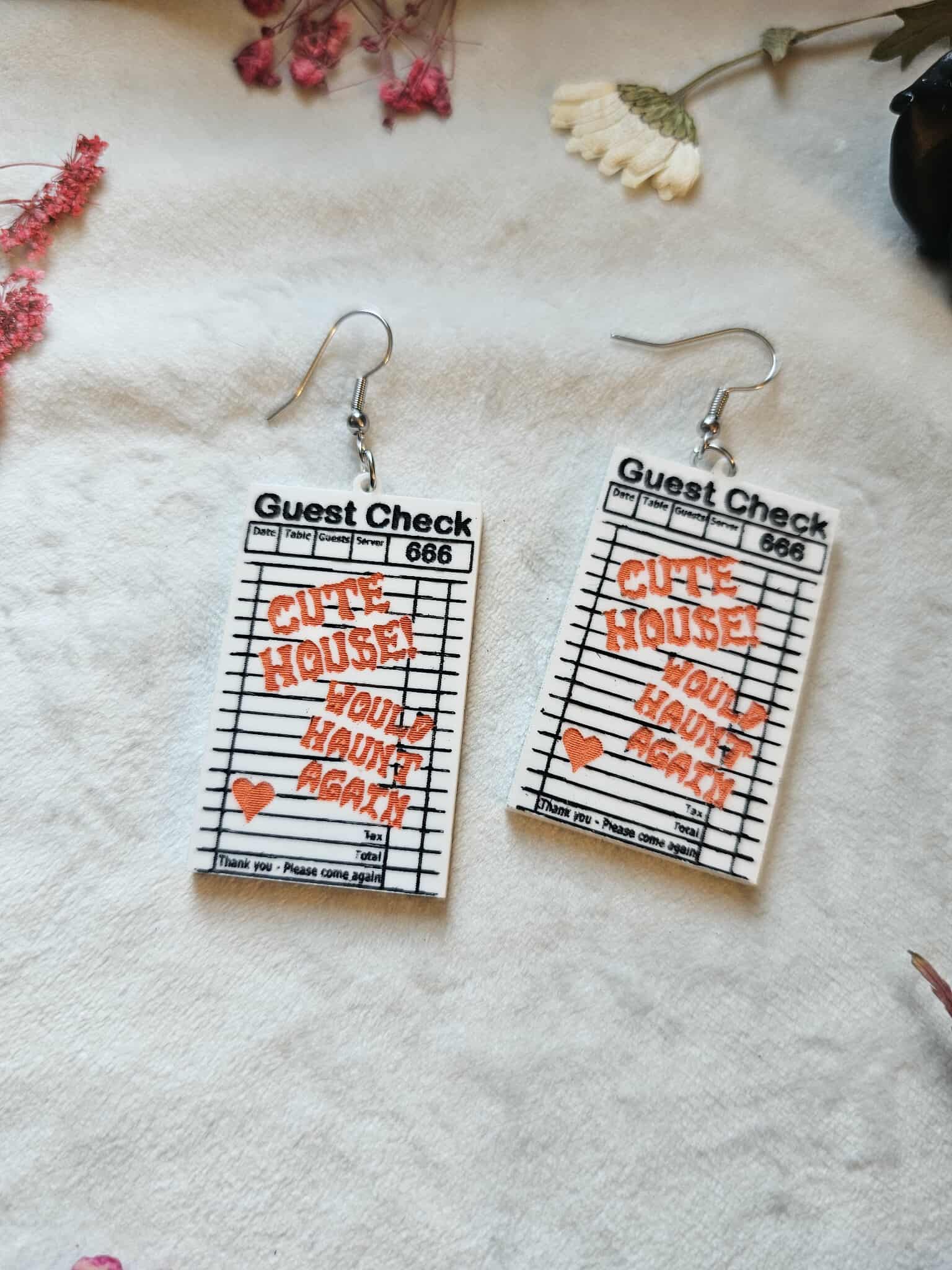 A mixture of acrylics with hand painted details. These cute house guest check earrings are the perfect acrylic earrings for Halloween and spooky season!