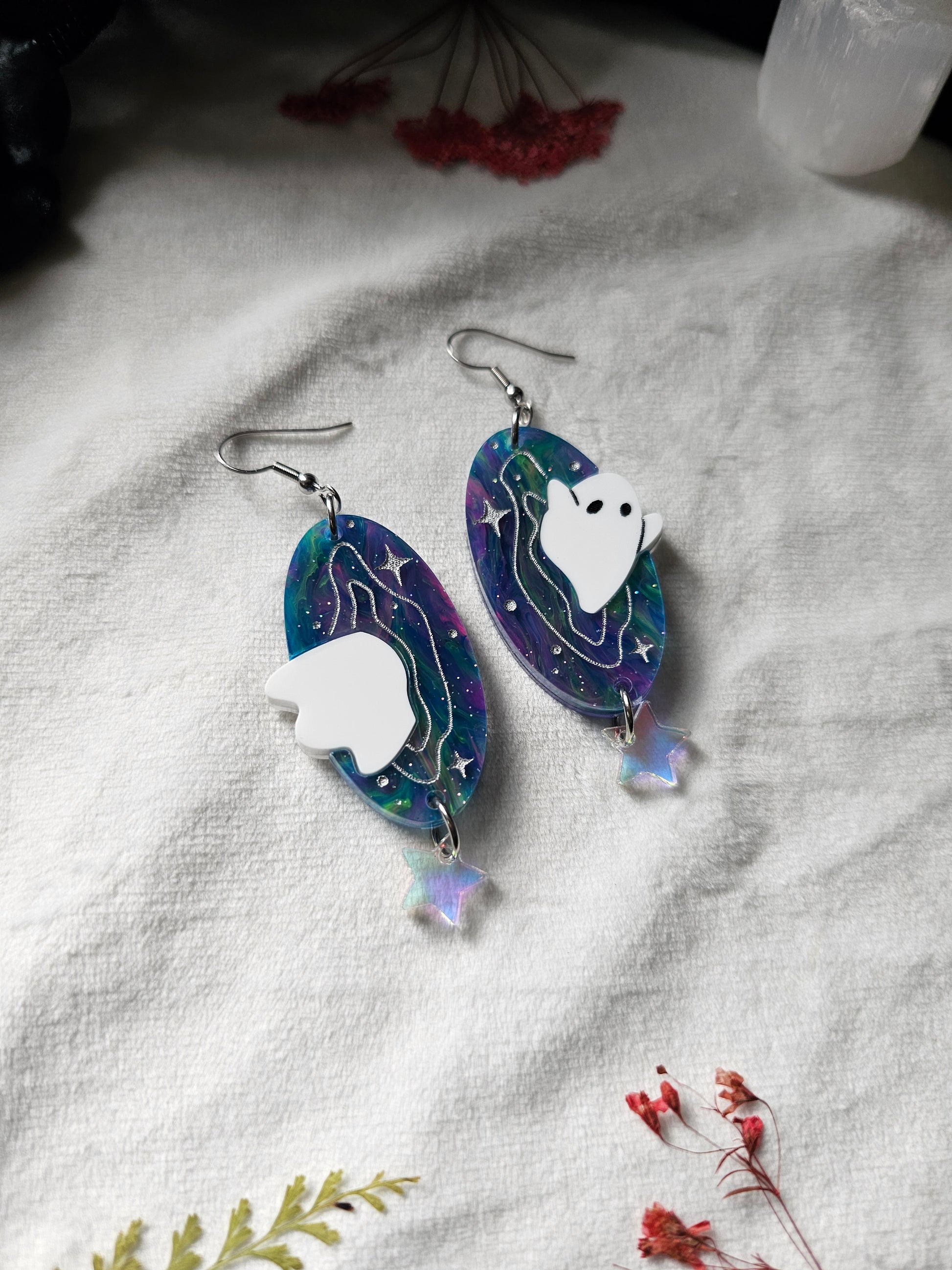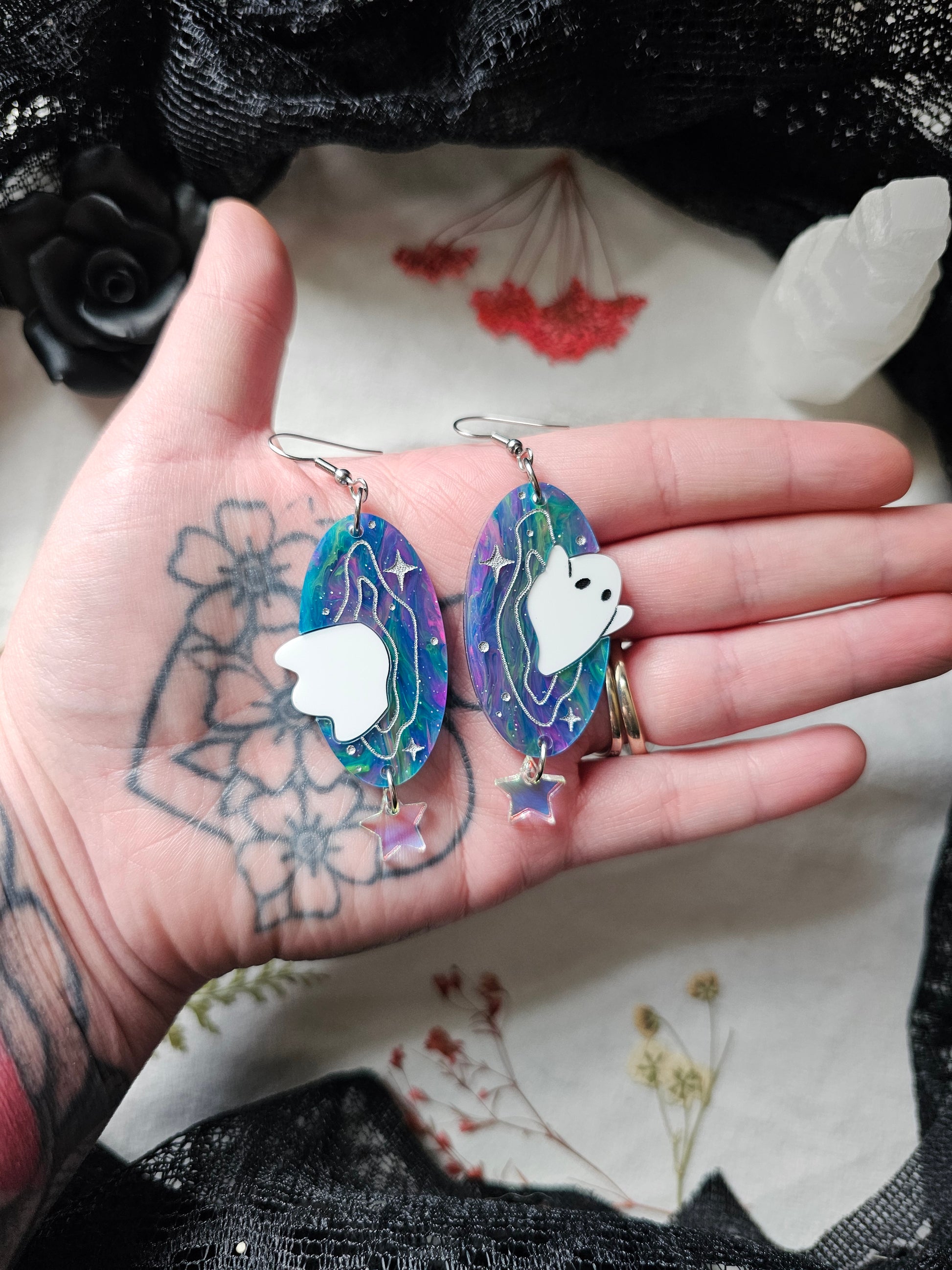 A mixture of acrylics with hand painted details. These ghost portal earrings are the perfect acrylic earrings for Halloween and spooky season!