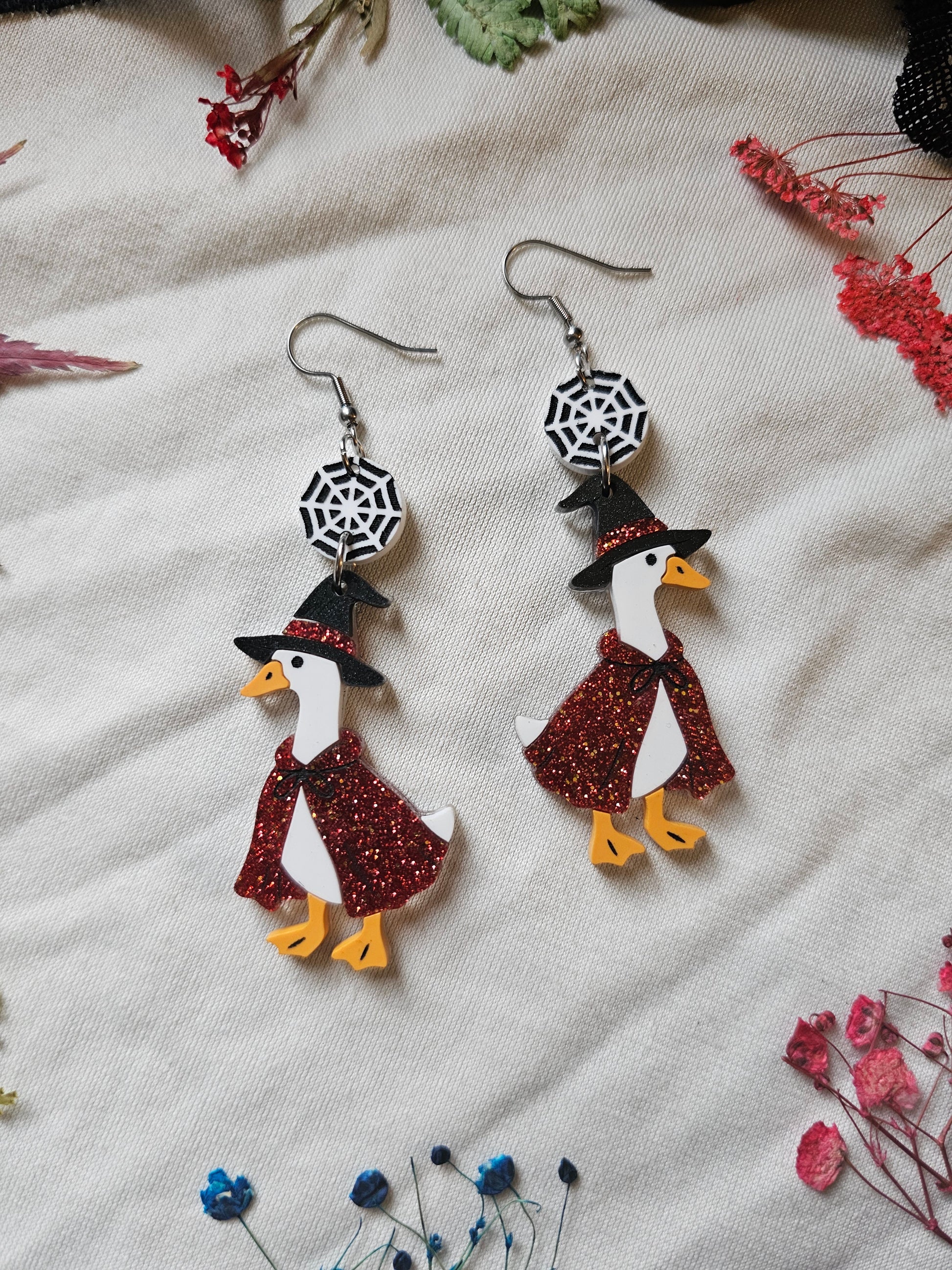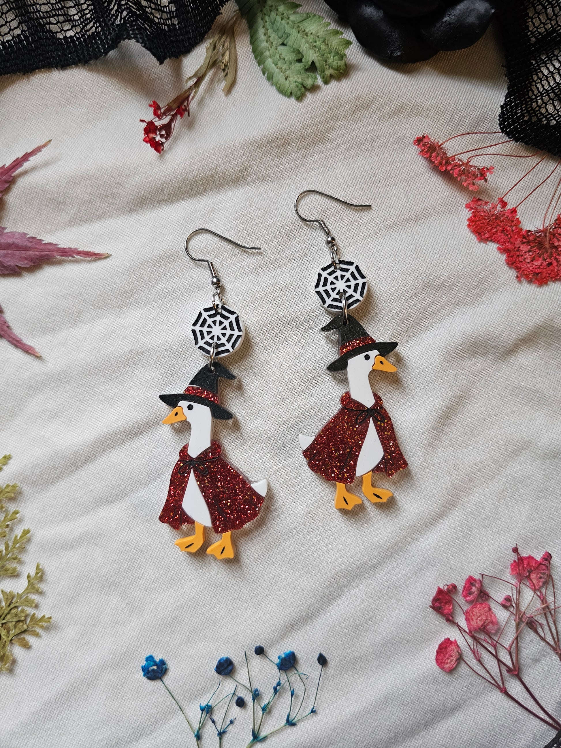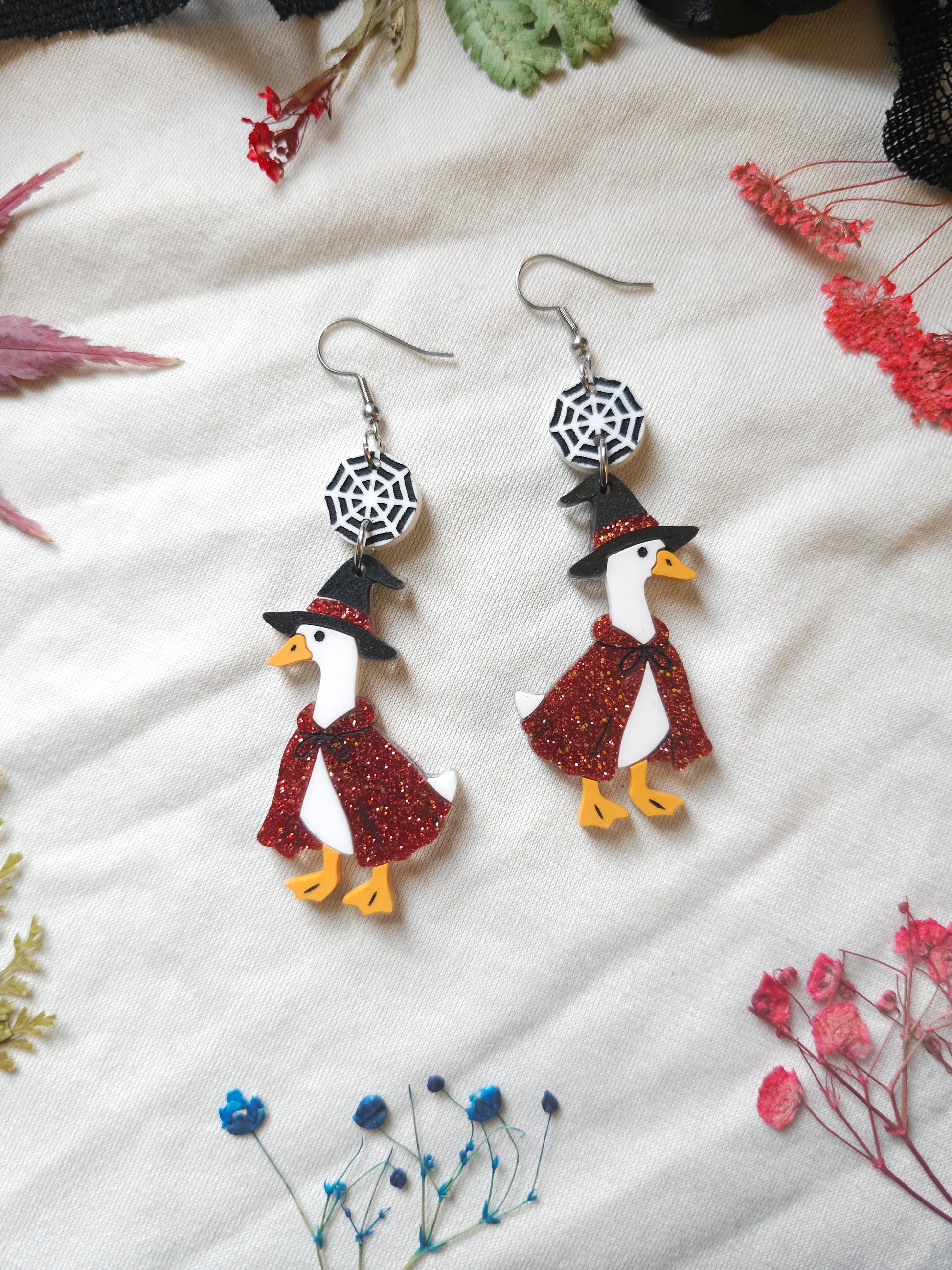 A mixture of acrylics with hand painted details. These witch goose earrings are the perfect acrylic earrings for Halloween and spooky season!