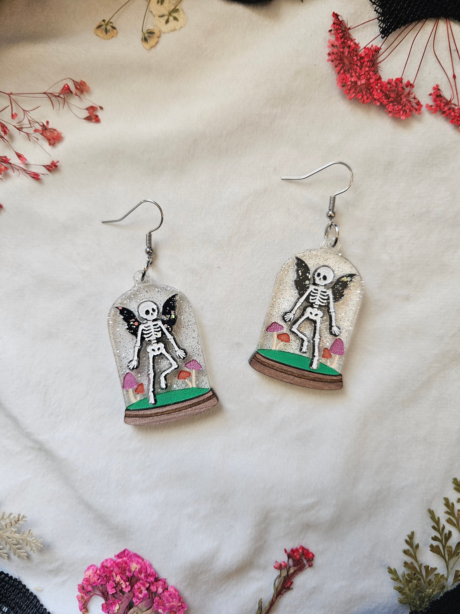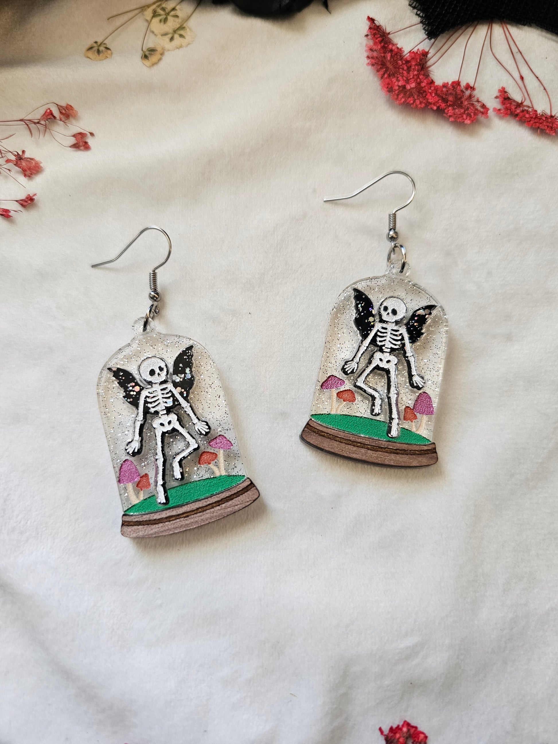 A mixture of glitter acrylics and wood with hand painted details. These fairy skeleton jars are the perfect acrylic earrings for Halloween & the lovers of oddities.