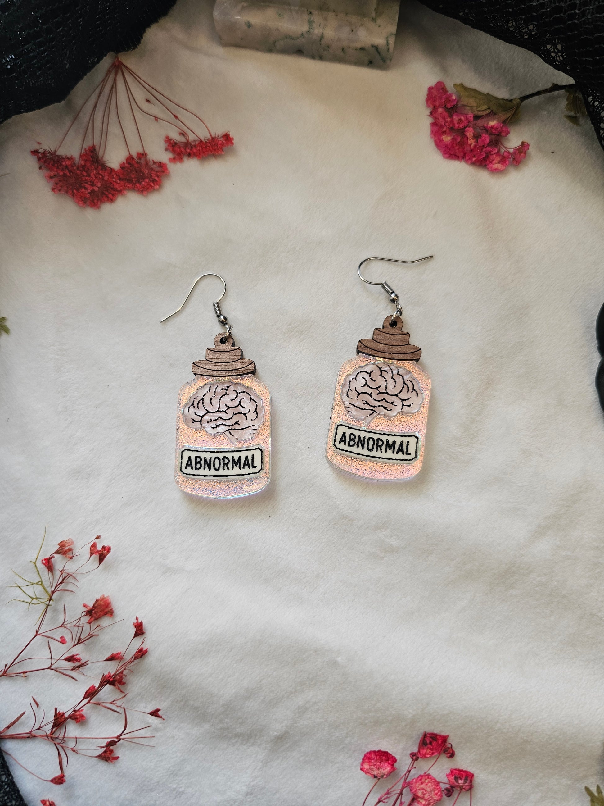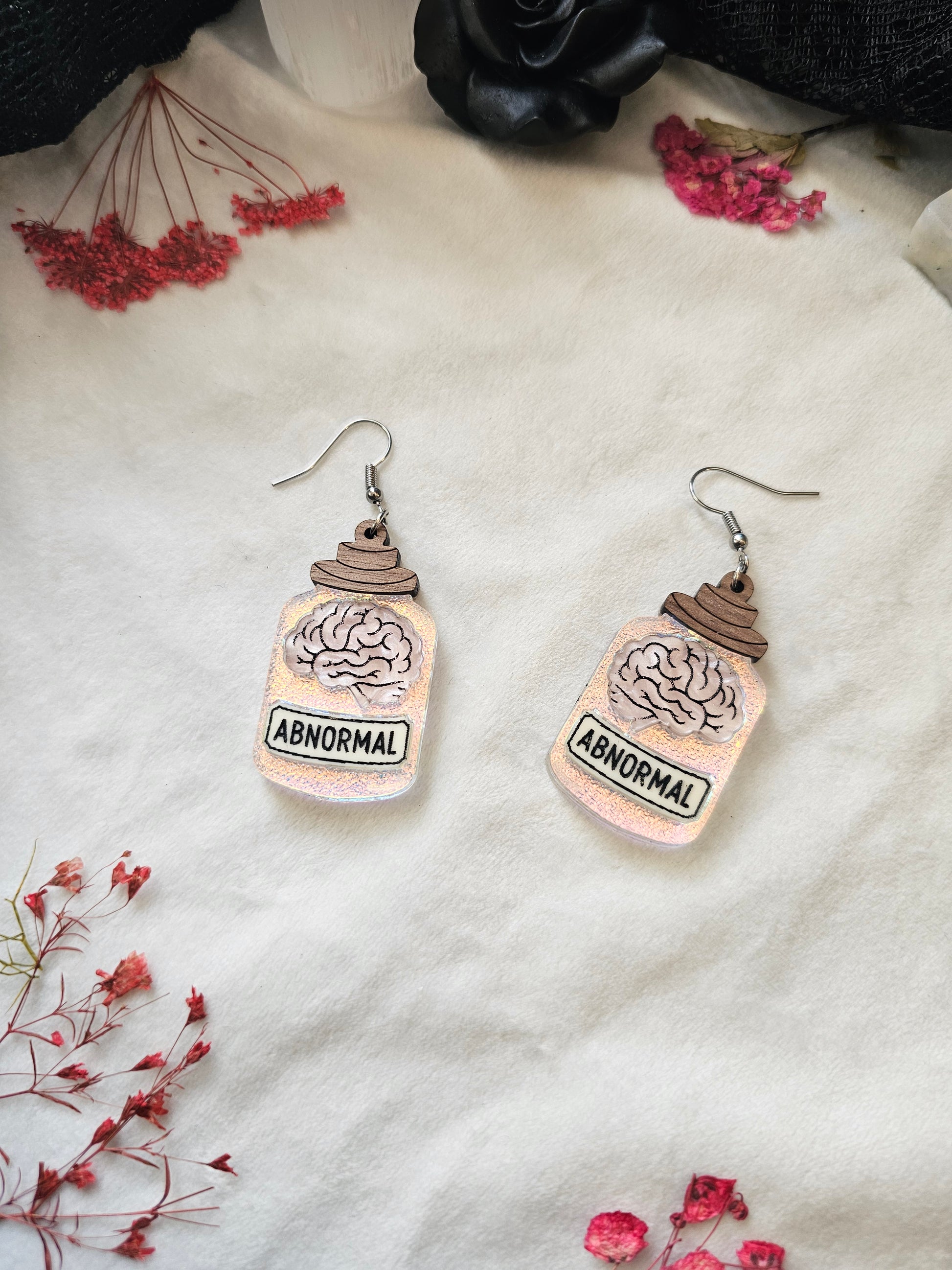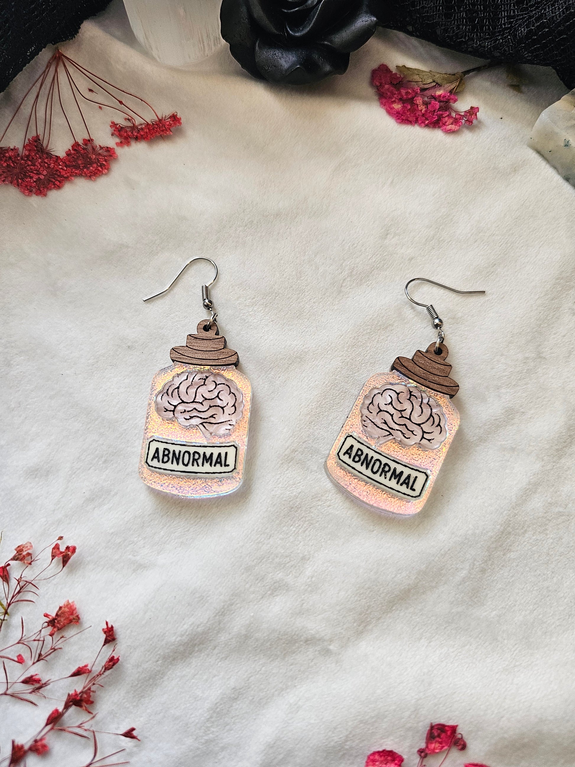 A mix of textured iridescent, matte, and pearl acrylics with hand painted details. These abnormal brain jars are the perfect acrylic earrings for Halloween & the lovers of oddities.