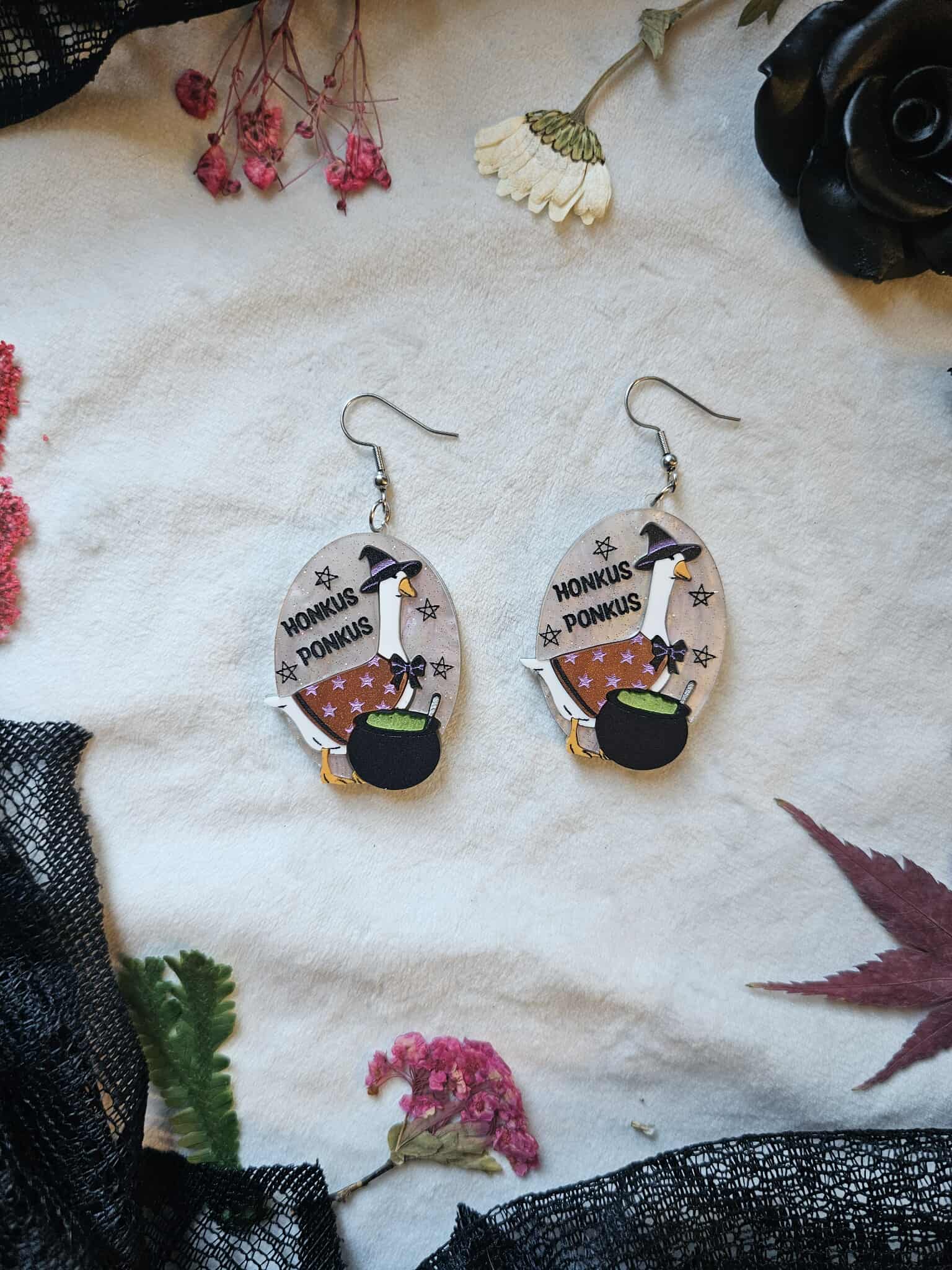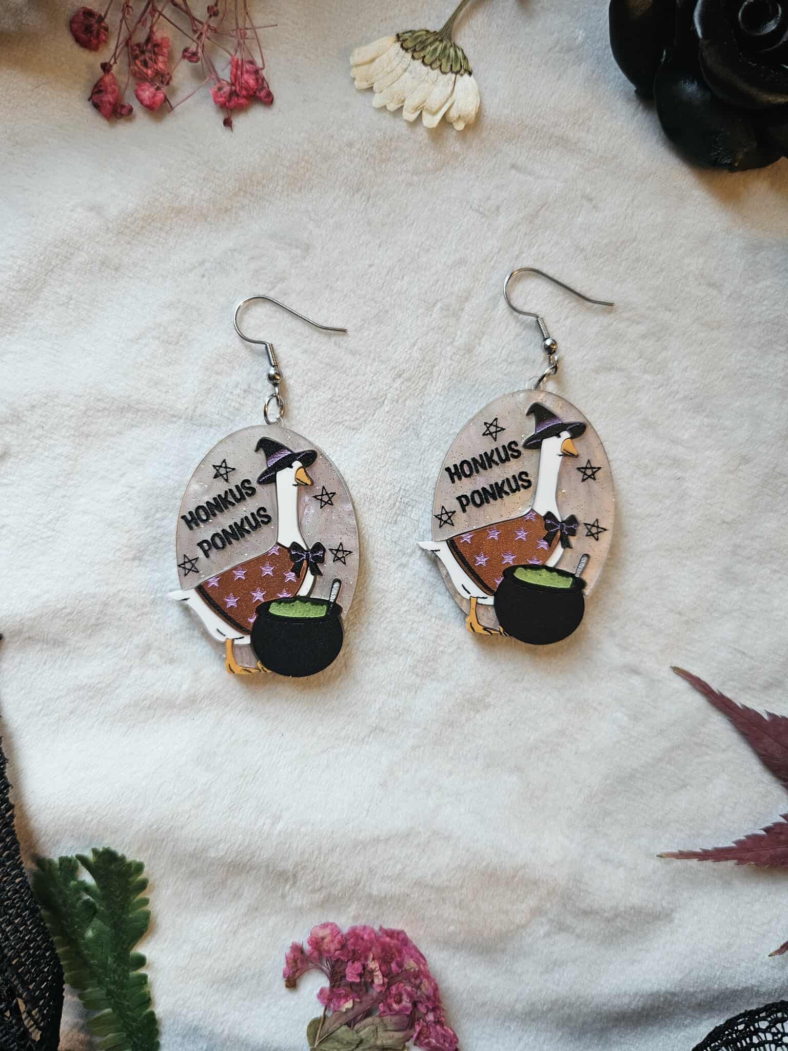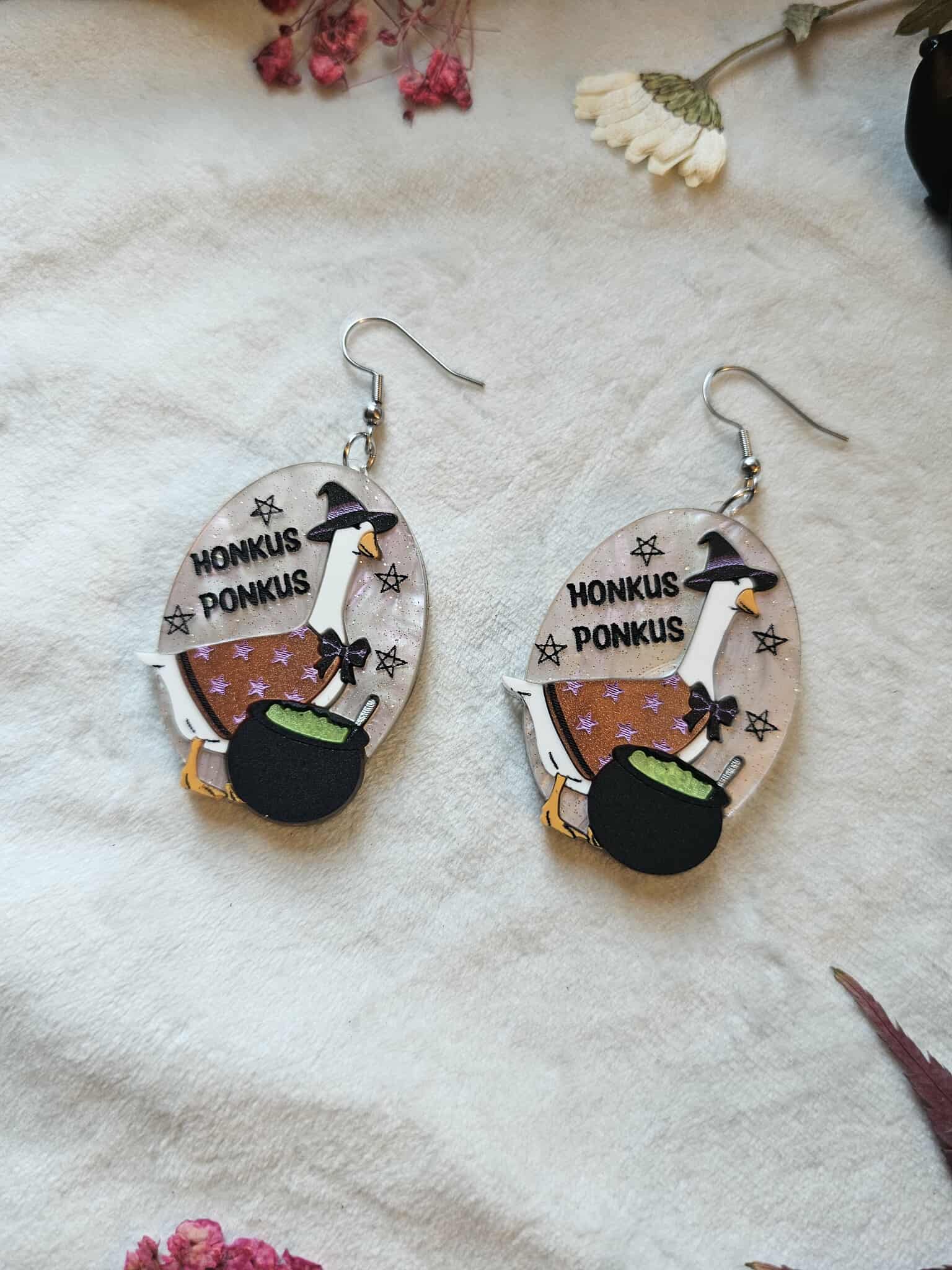 A mixture of acrylics with hand painted details. These Honkus Ponkus goose earrings are the perfect acrylic earrings for Halloween and spooky season!