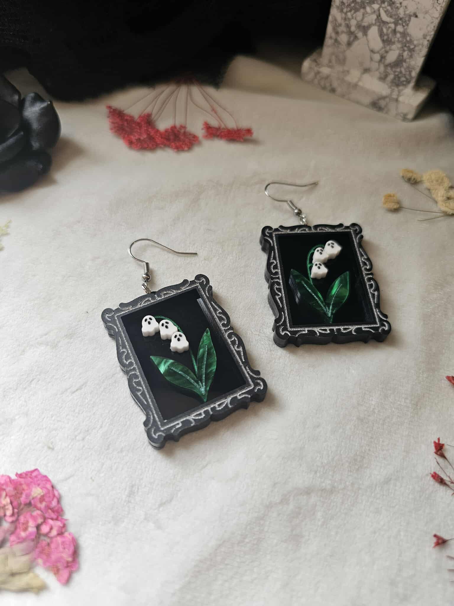 A mixture of acrylics with hand painted details. These framed bird skull earrings are the perfect acrylic earrings for Halloween & the lovers of oddities.