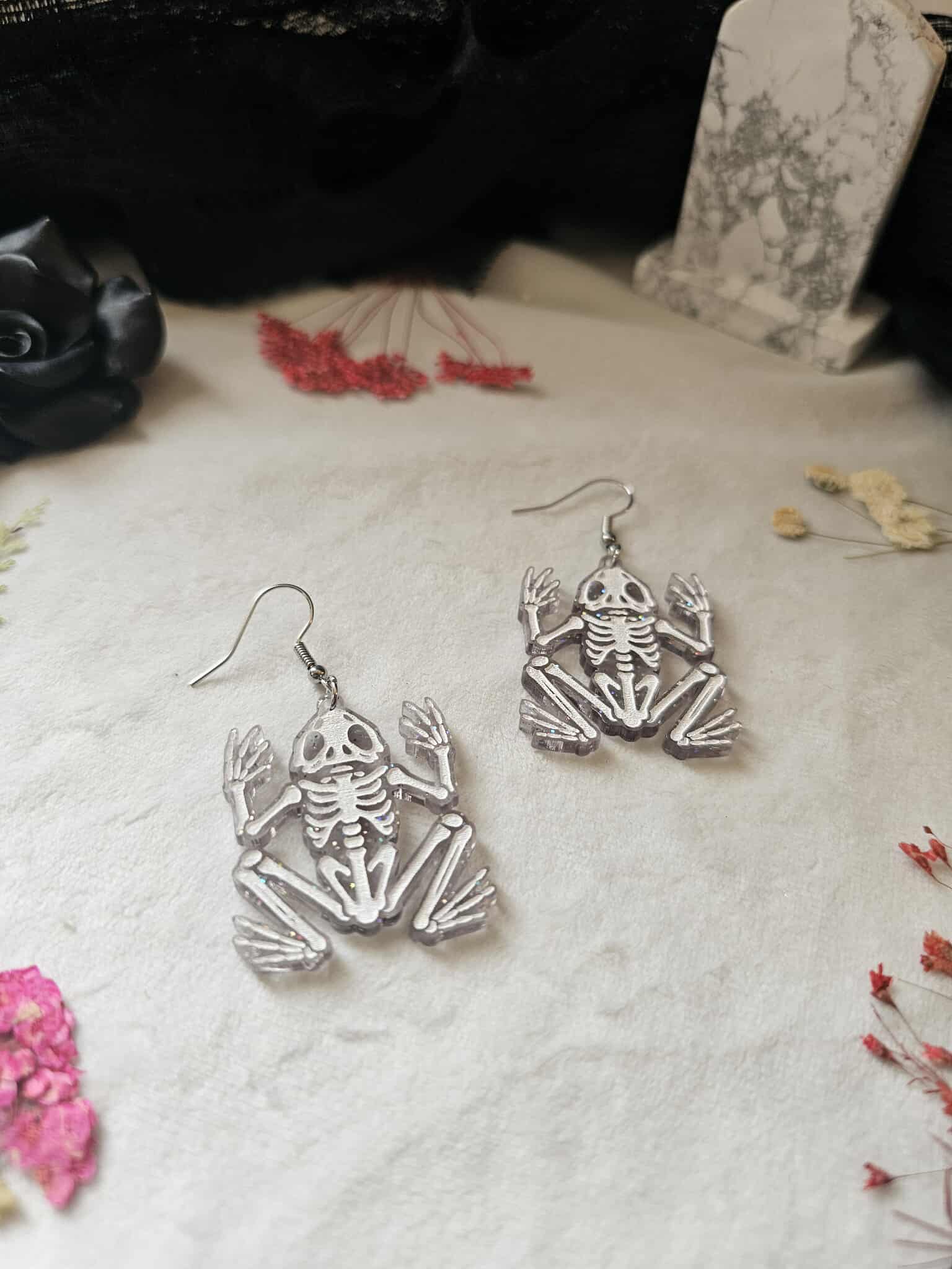 A single layer of grey transparent glitter acrylic with hand painted details. These frog skeleton earrings are the perfect acrylic earrings for Halloween & the lovers of oddities.