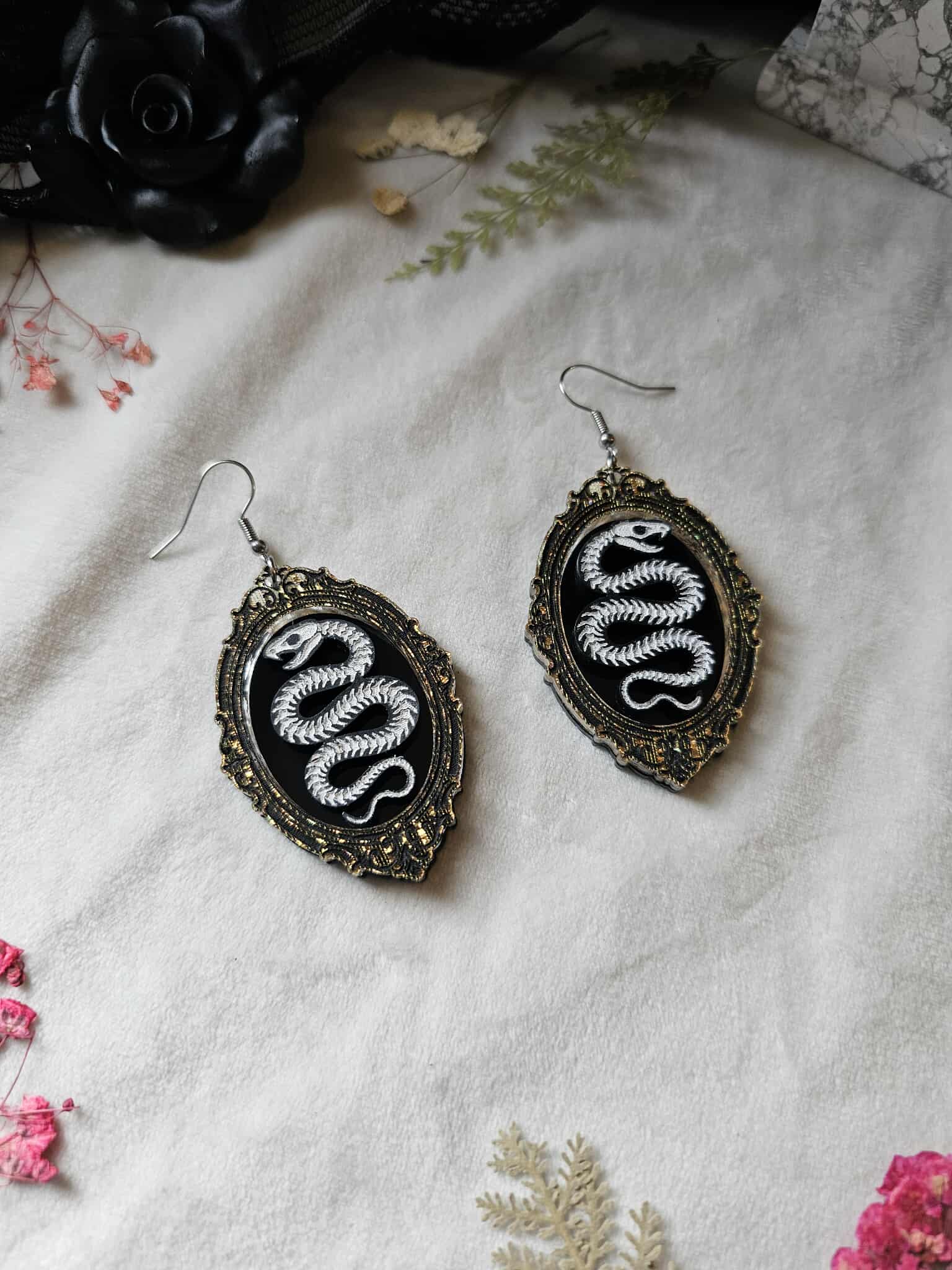 A mixture of acrylics with hand painted details. These framed snake skeleton earrings are the perfect acrylic earrings for Halloween & the lovers of oddities.
