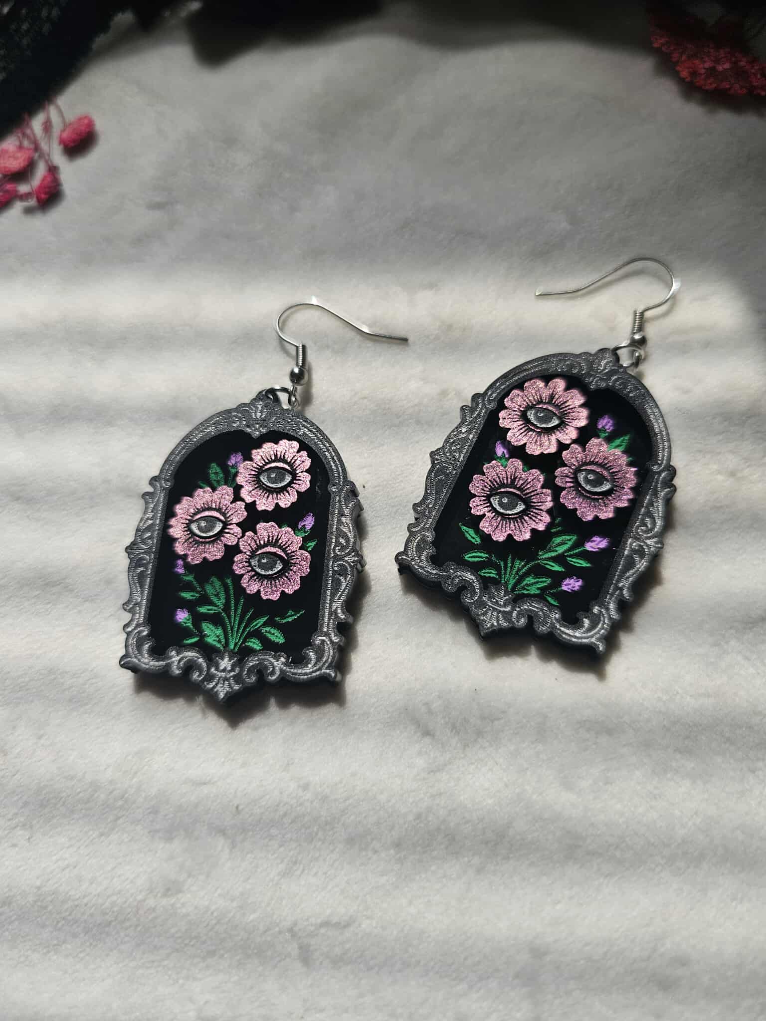 A mixture of acrylics with hand painted details. These framed eye flowers are the perfect acrylic earrings for Halloween & the lovers of oddities.