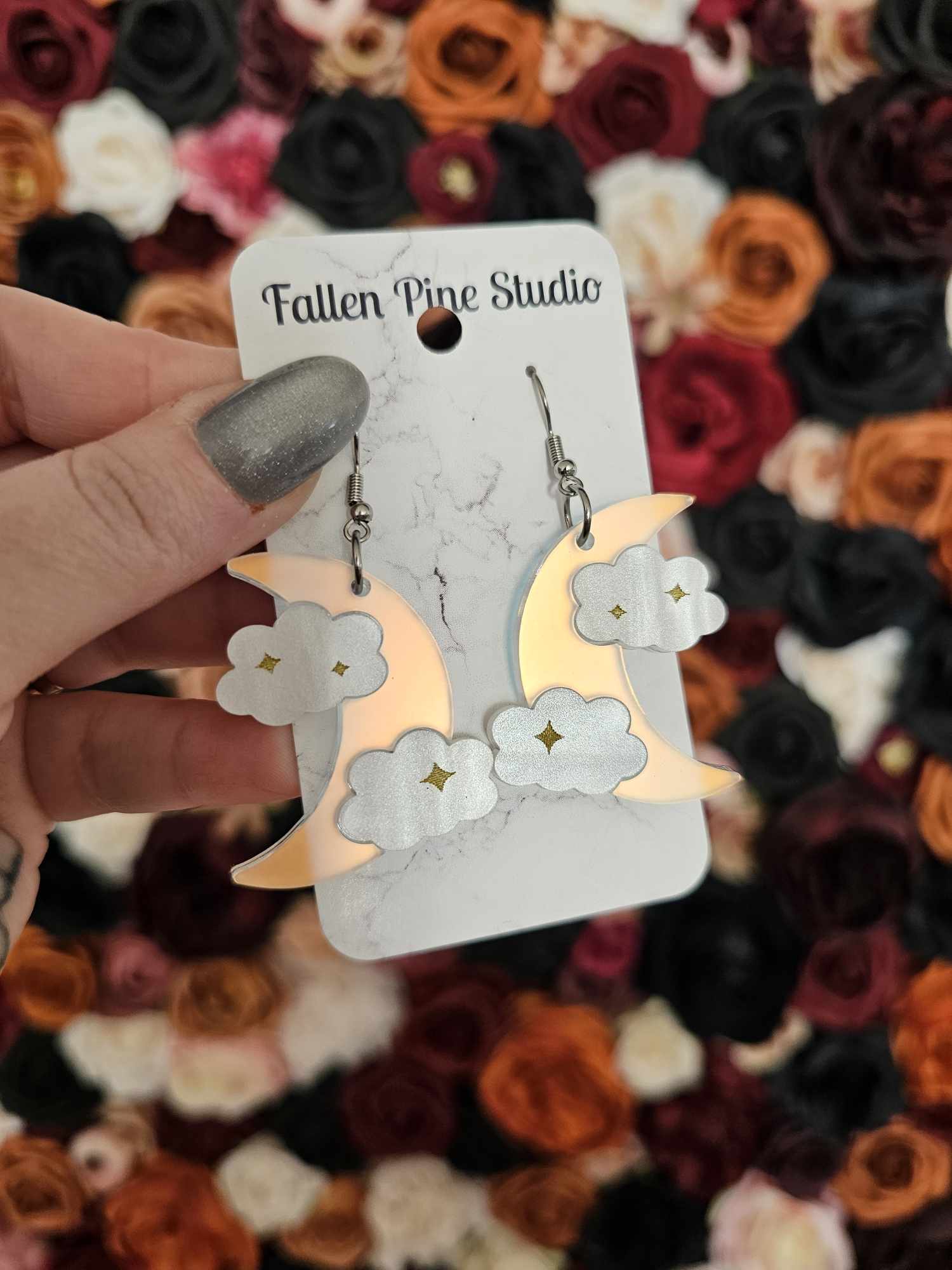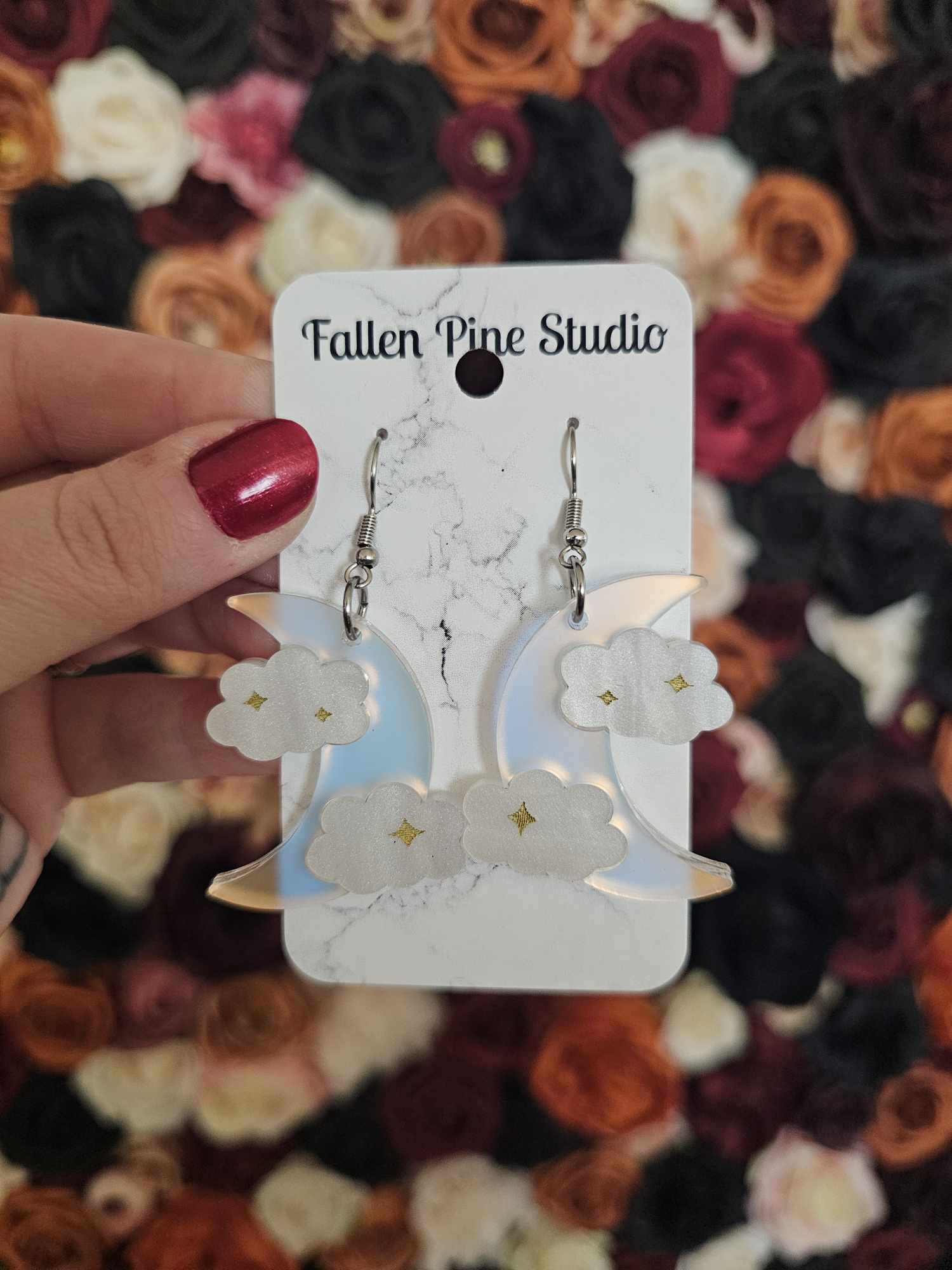 The prettiest frosted iridescent acrylic earrings with white shimmer clouds.