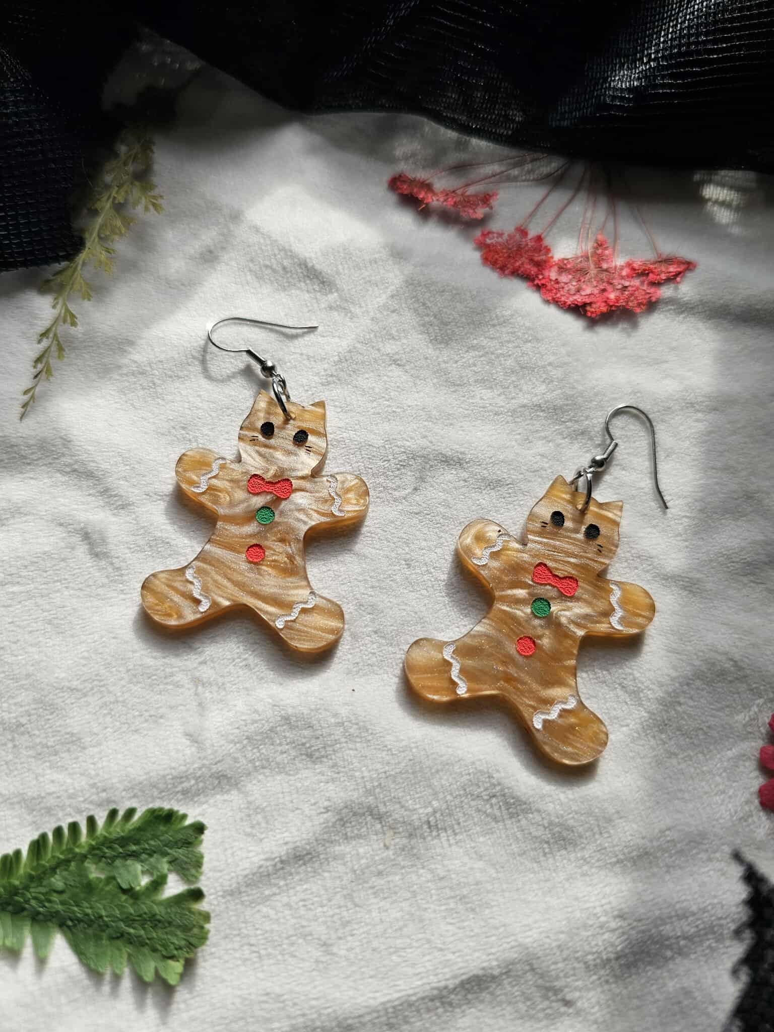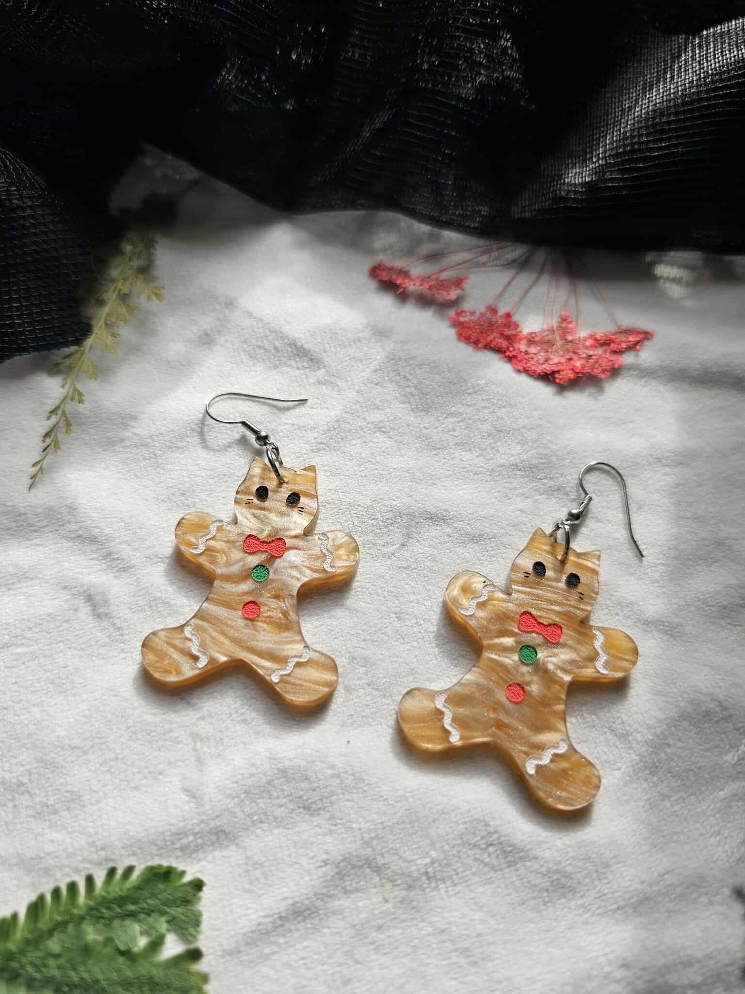 A mixture of acrylics with hand painted details. These gingerbread kitten acrylic earrings are perfect for the winter season and holidays.