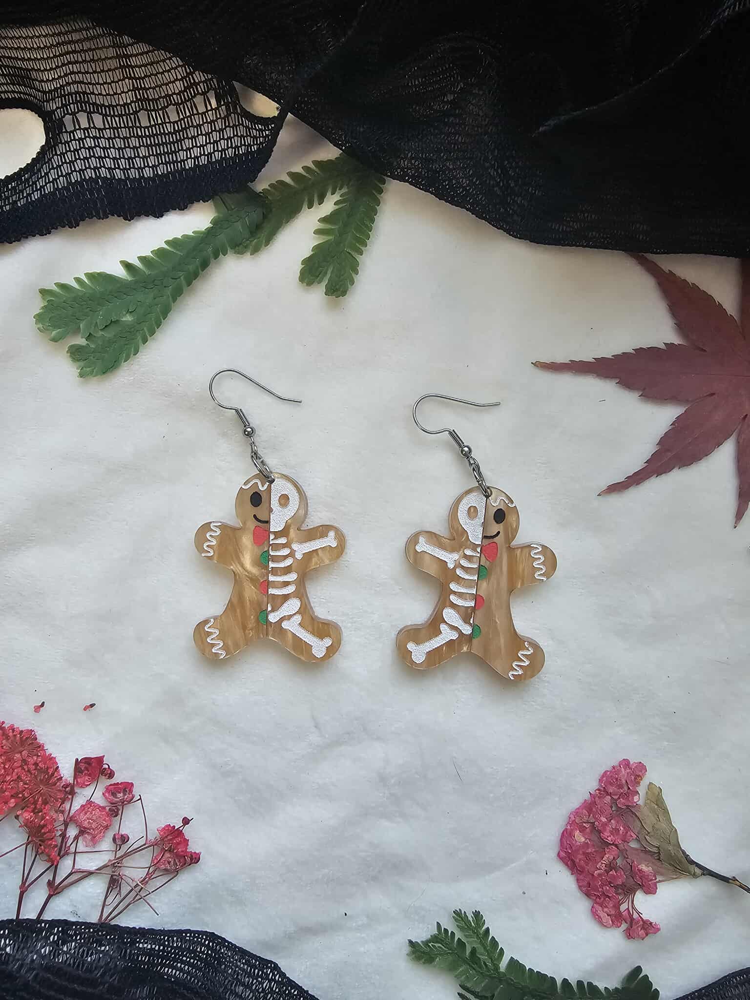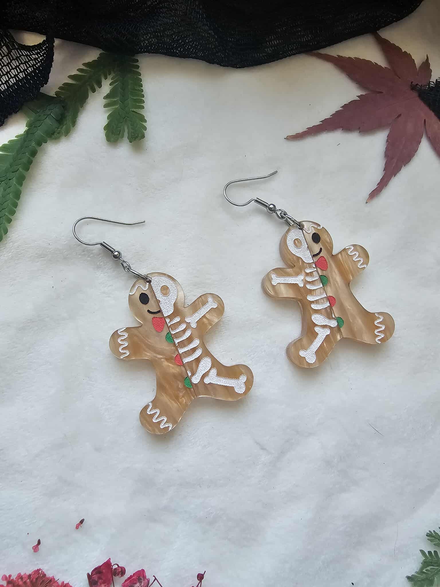 A mixture of acrylics with hand painted details. These half dead gingerbread acrylic earrings are perfect for the winter season and holidays - with gothmas twist.