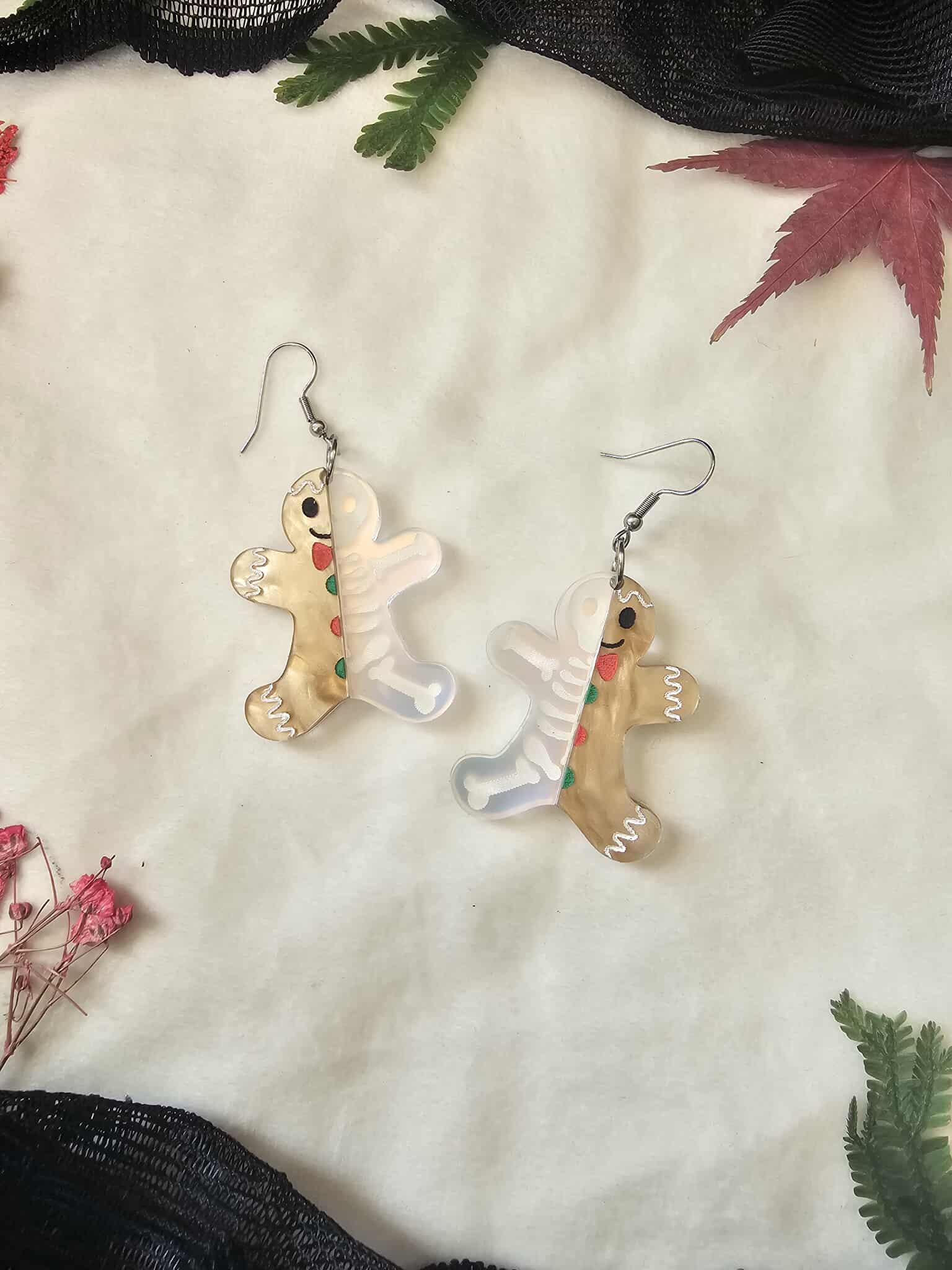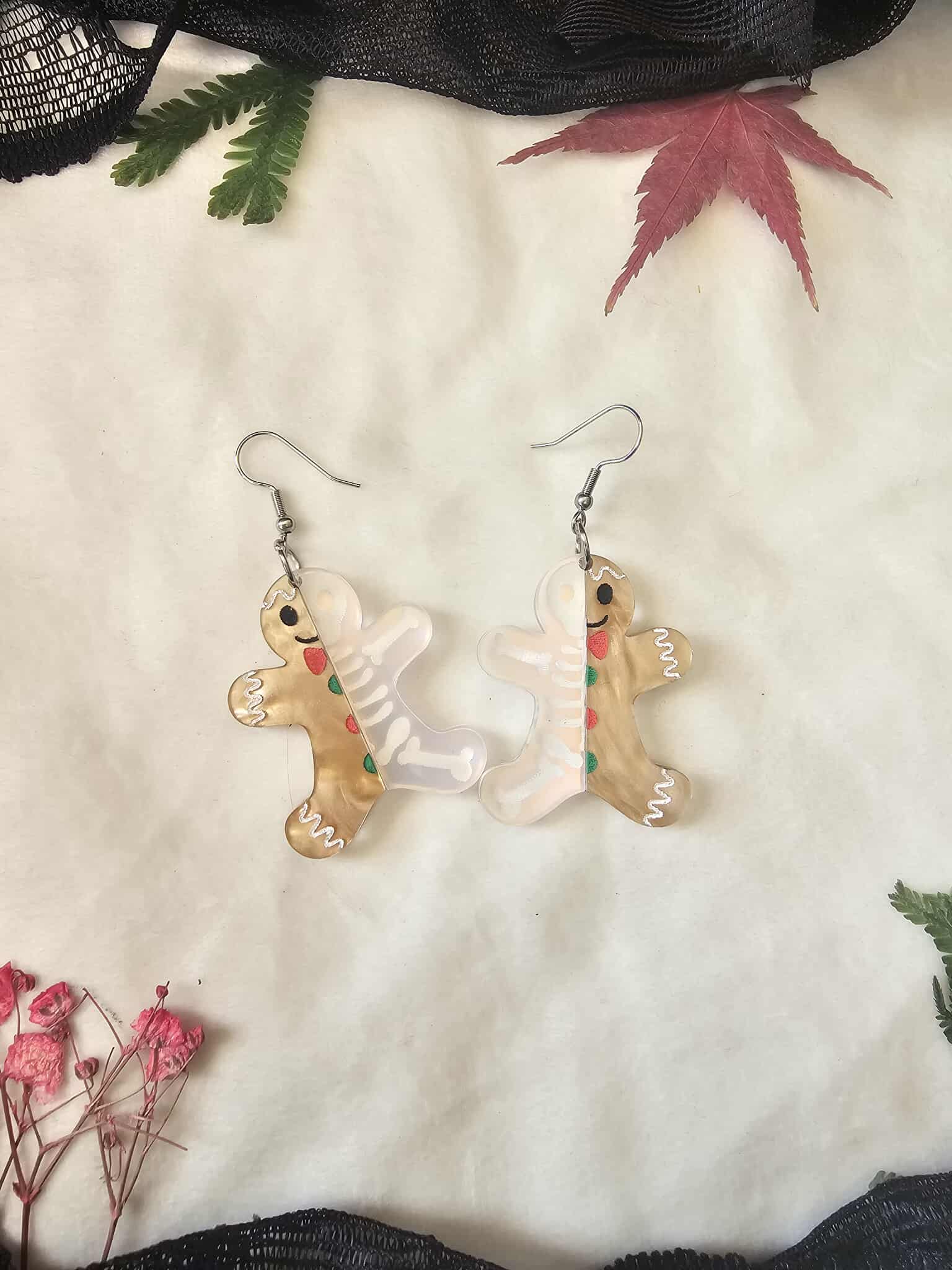 A mixture of acrylics with hand painted details. These half dead gingerbread acrylic earrings are perfect for the winter season and holidays - with gothmas twist.