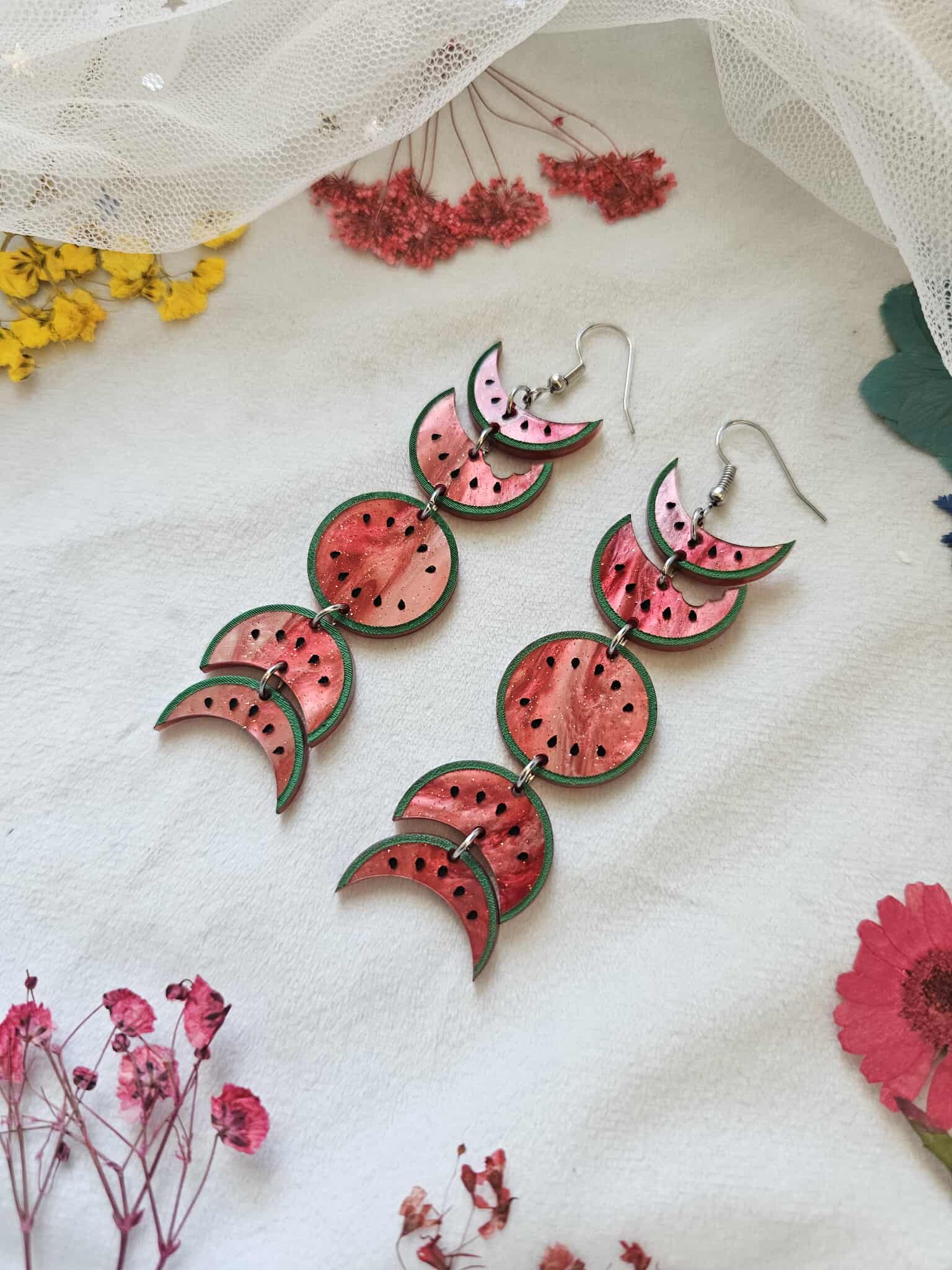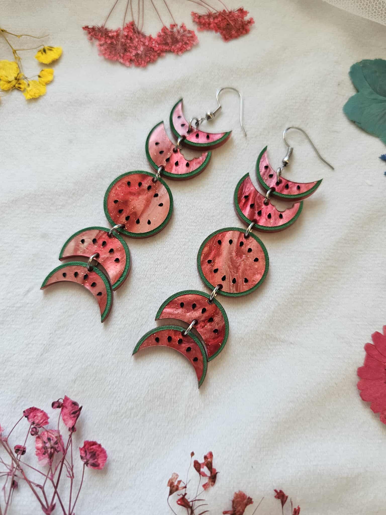 There's nothing better in the summer than a fresh, juicy watermelon! These watermelon moon phase  earrings are made with marbled acrylic with hand painted details.