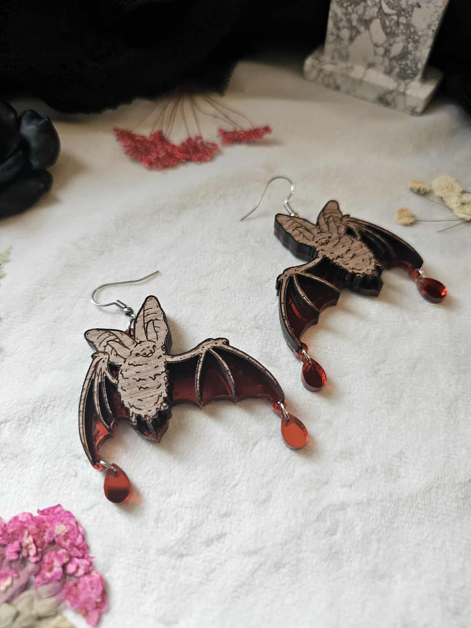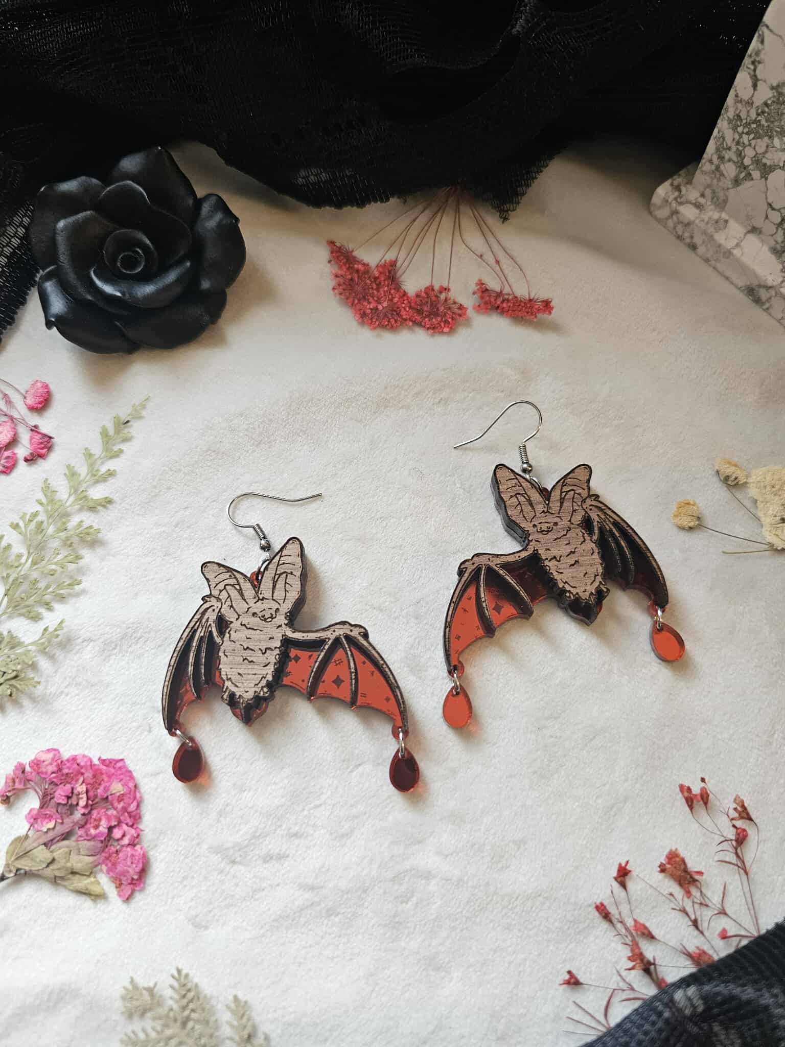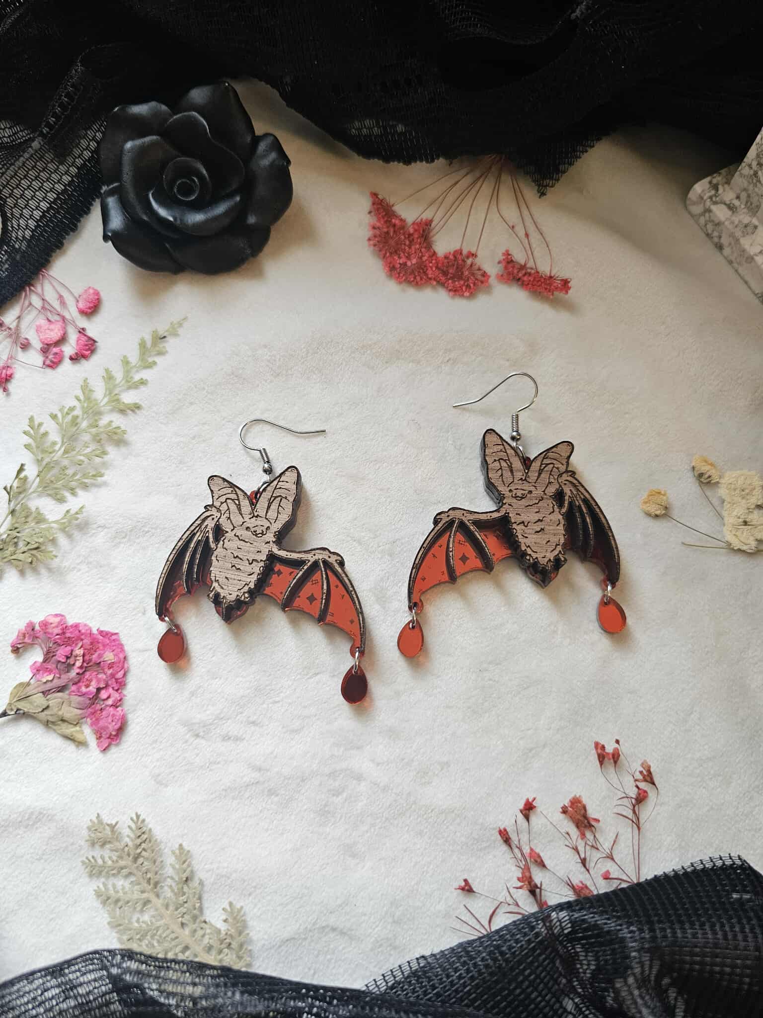 A layer of red mirror acrylic and walnut wood. These flying bats are the perfect acrylic earrings for Halloween & the lovers of oddities.