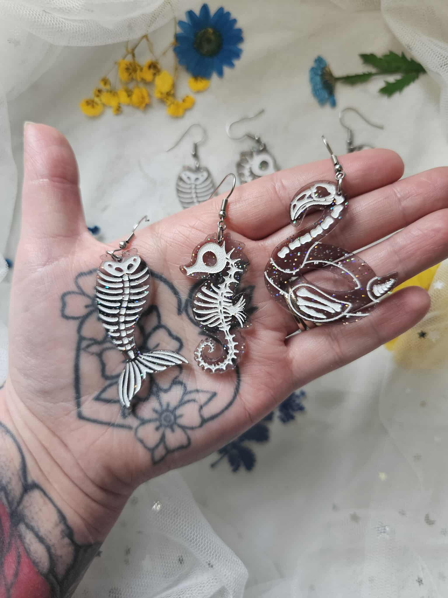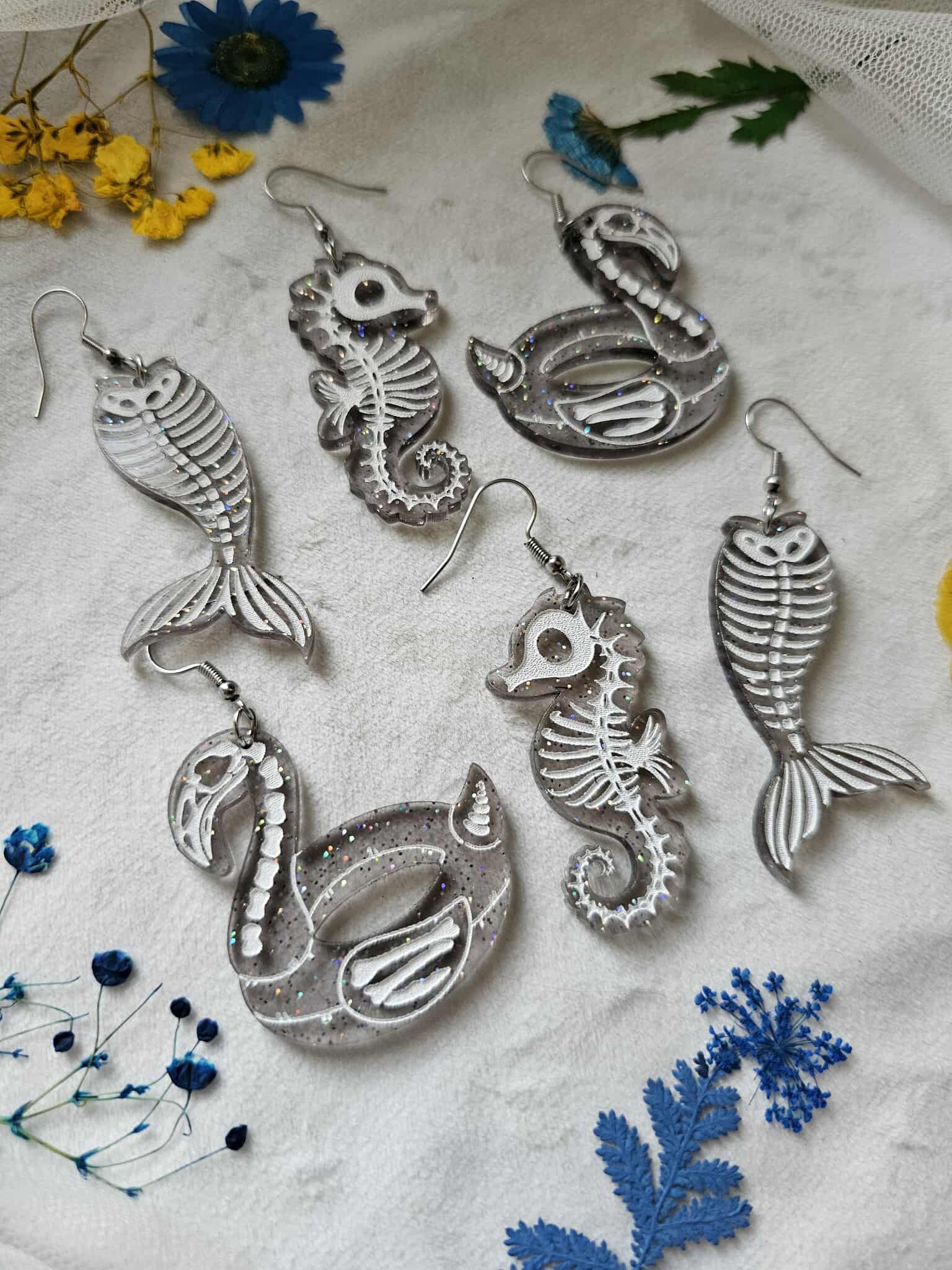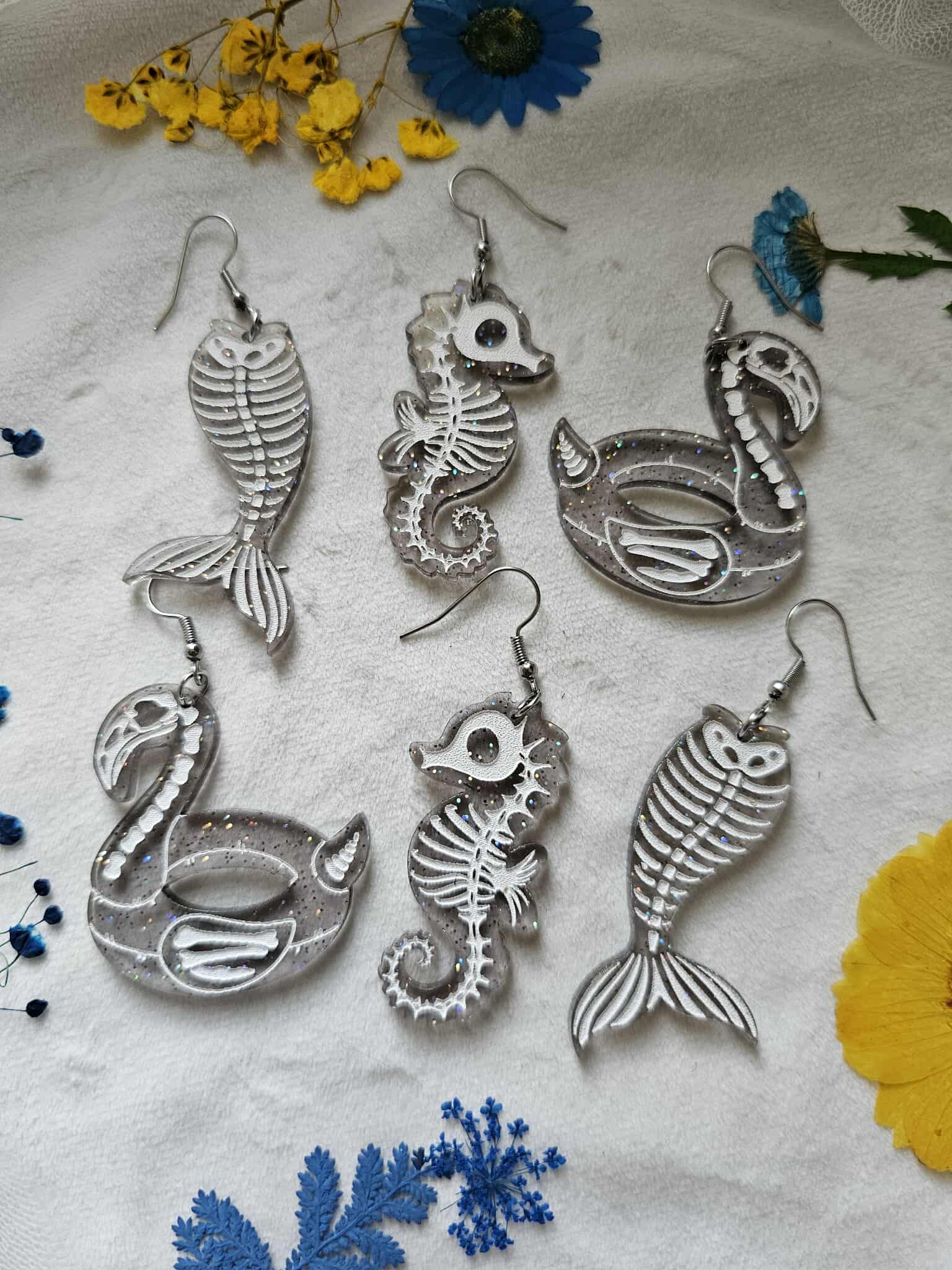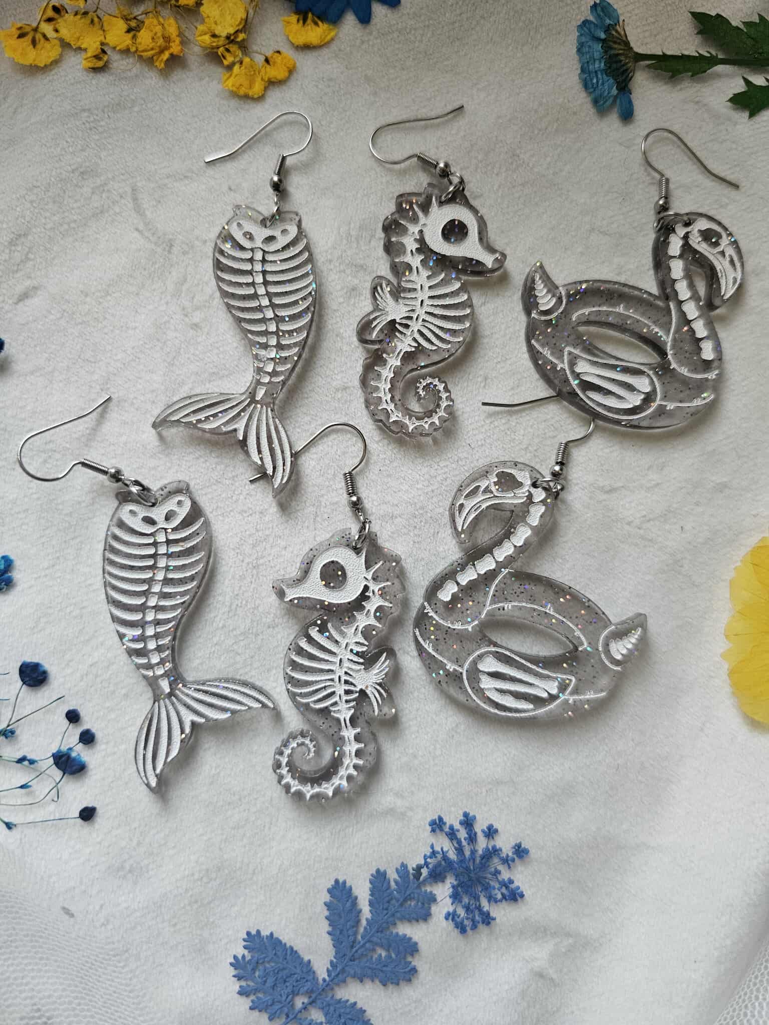 Your choice of mermaid tail, seahorse, or flamingo floatie earrings. These summer skeleton earrings are made a grey transparent glitter acrylic with hand painted details.