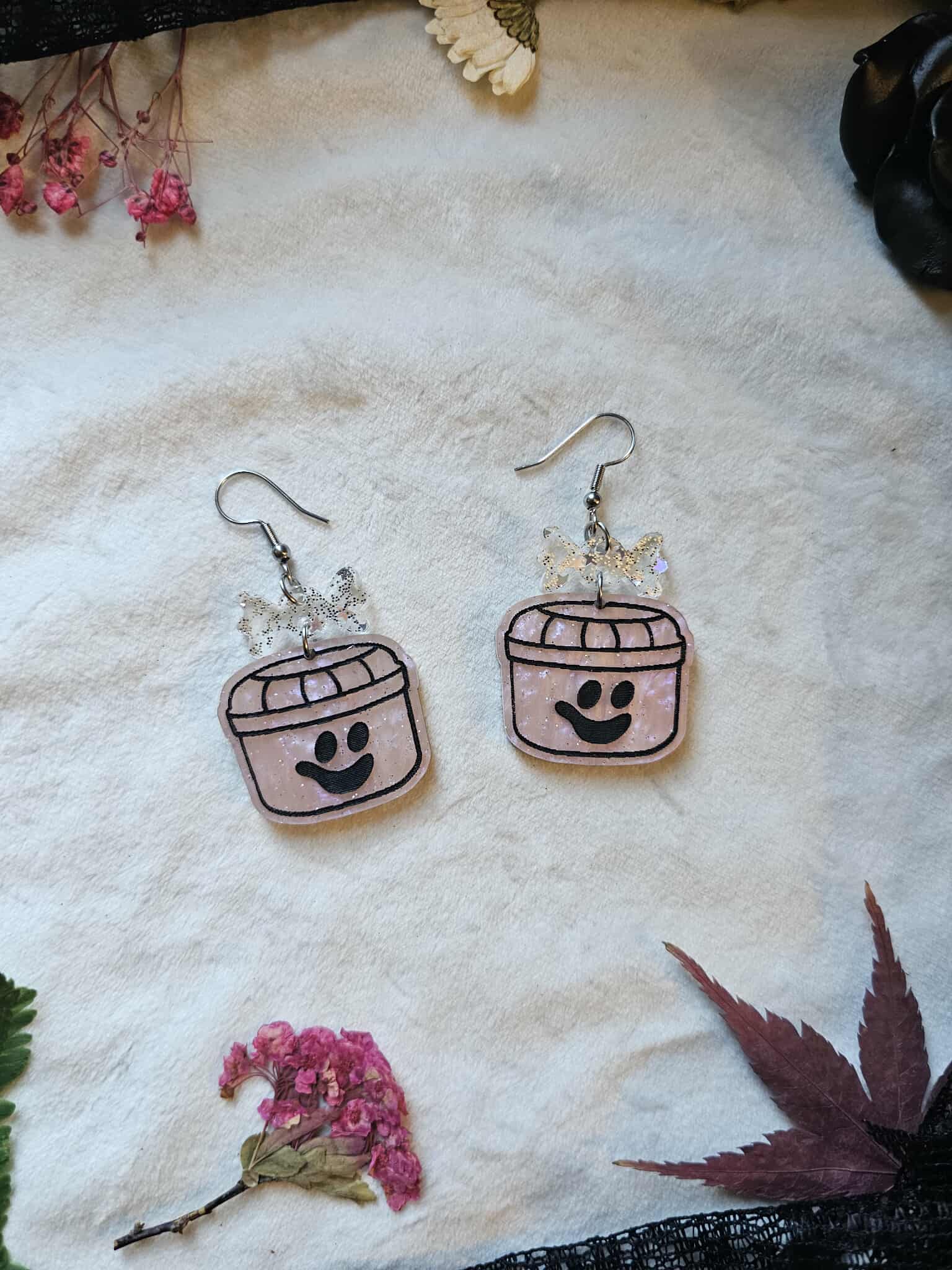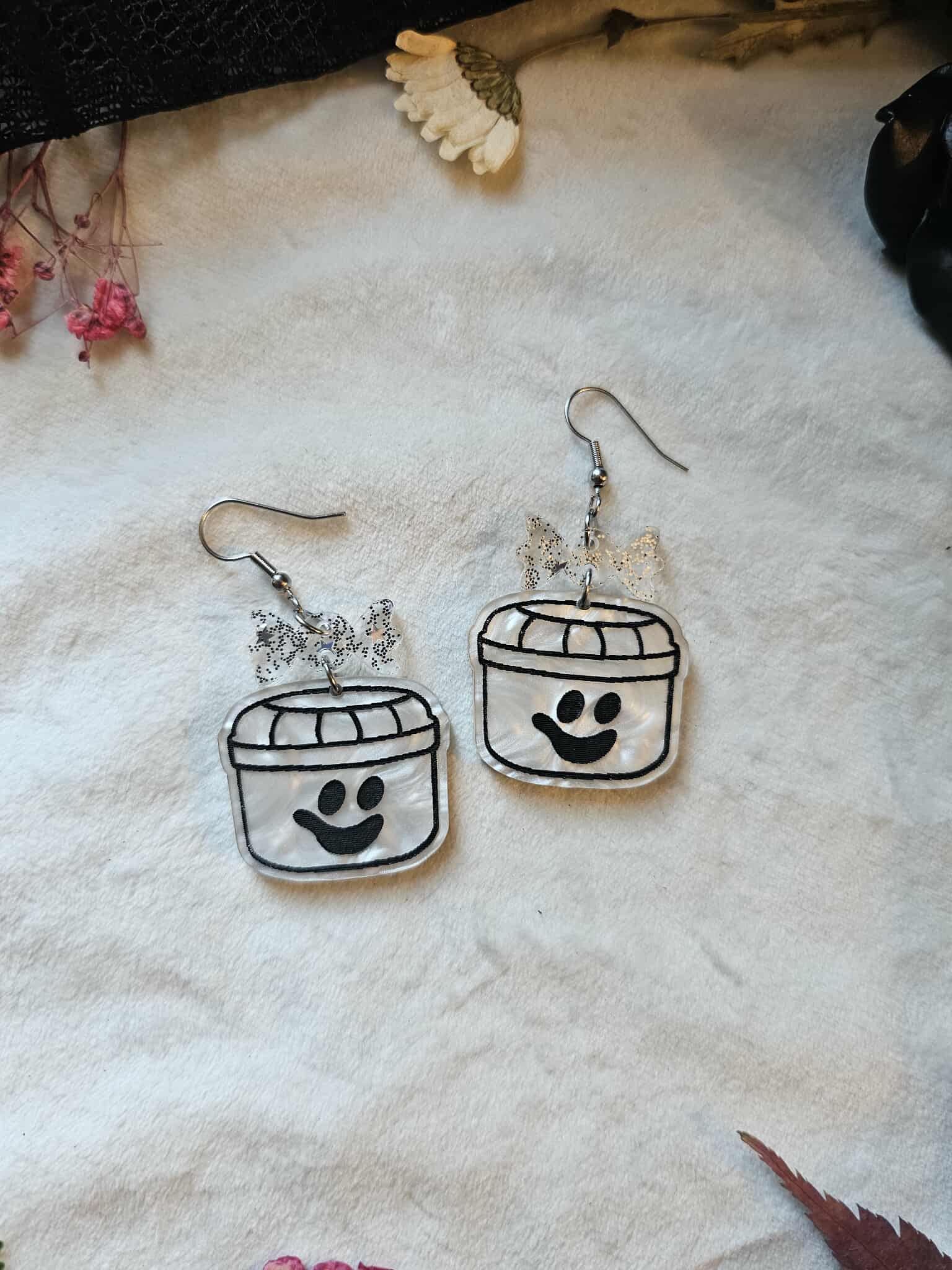 A mixture of acrylics with hand painted details. These treat bucket earrings are the perfect acrylic earrings for Halloween and spooky season!