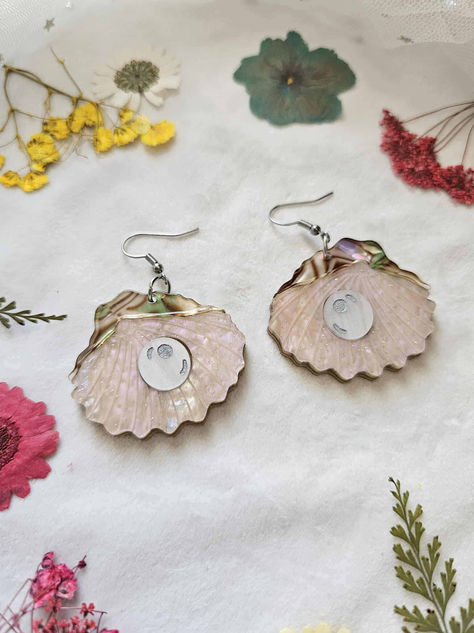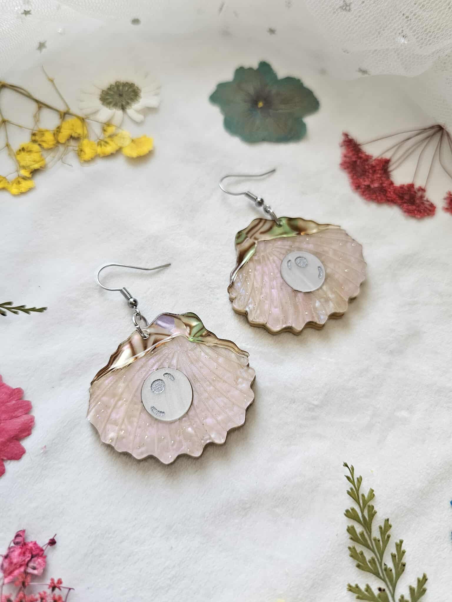 Oyster earrings with a shimmer pearl. These pearl oyster earrings are made with marble and fancy acrylics with hand painted details.