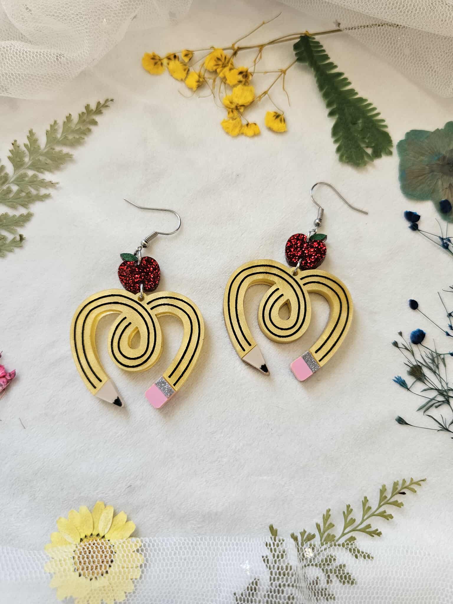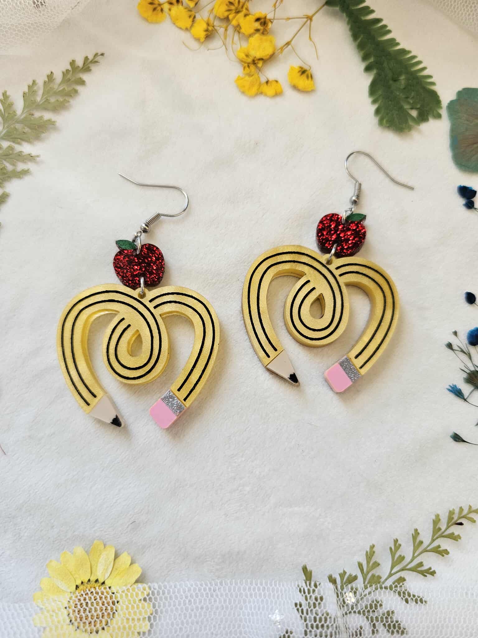 These cute bendy pencil earrings are made with yellow shimmer laser cut acrylic with hand painted details! These earrings are perfect for librarians, teachers, or readers!