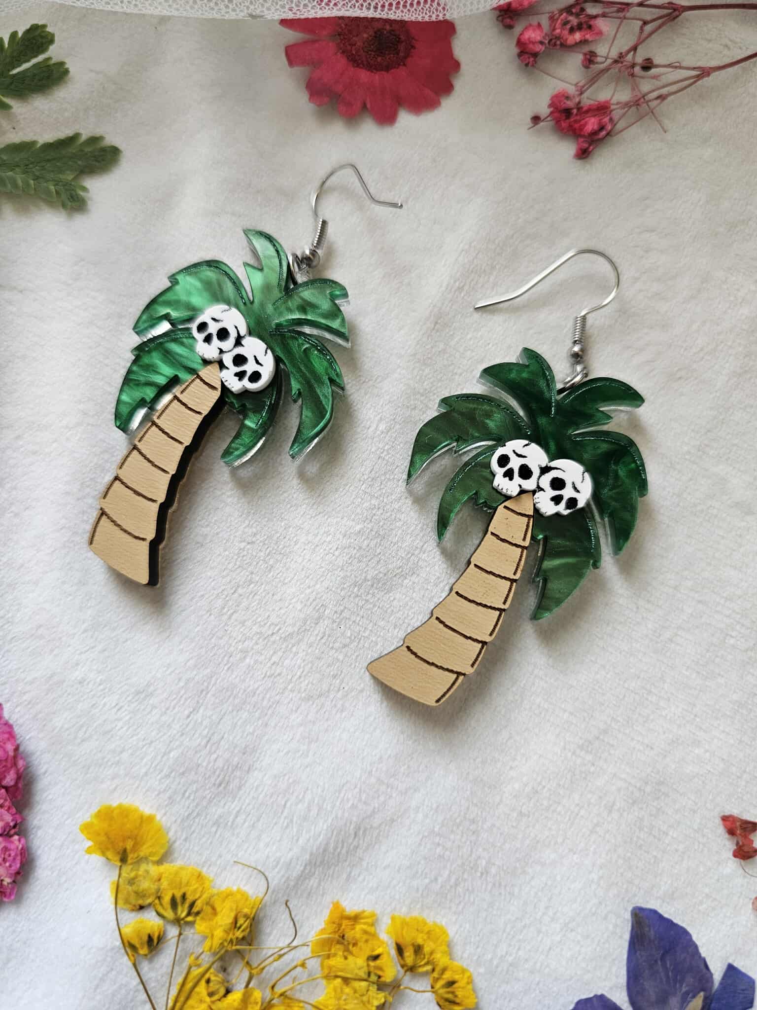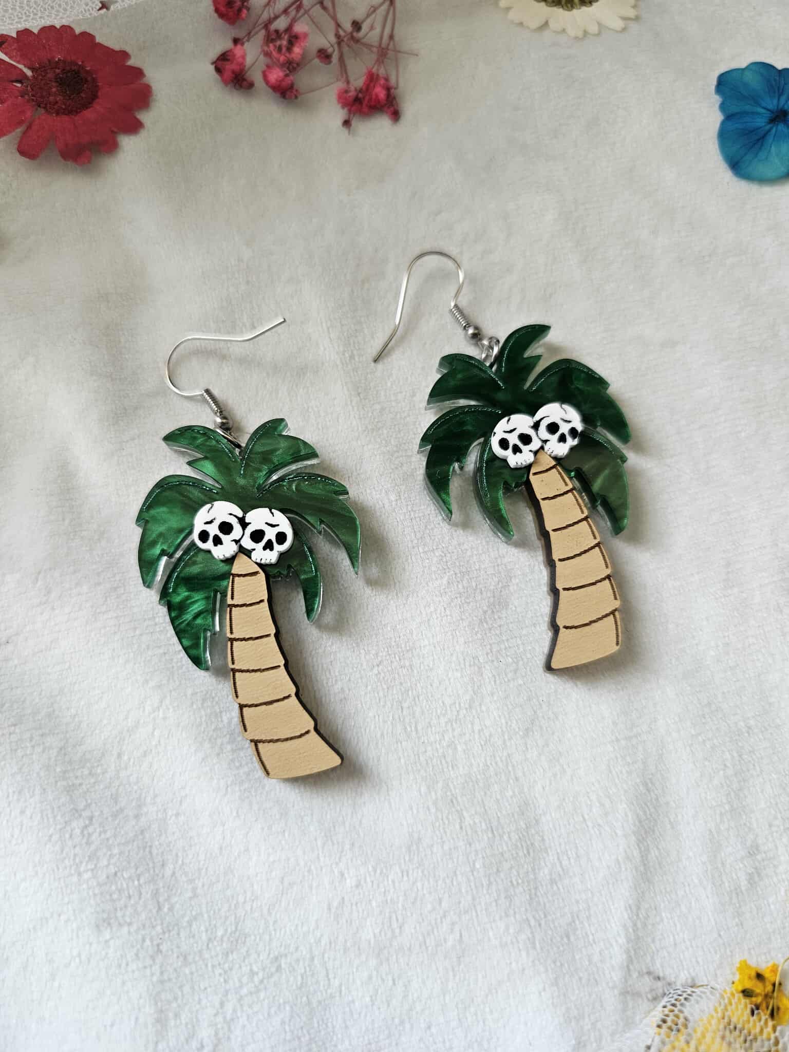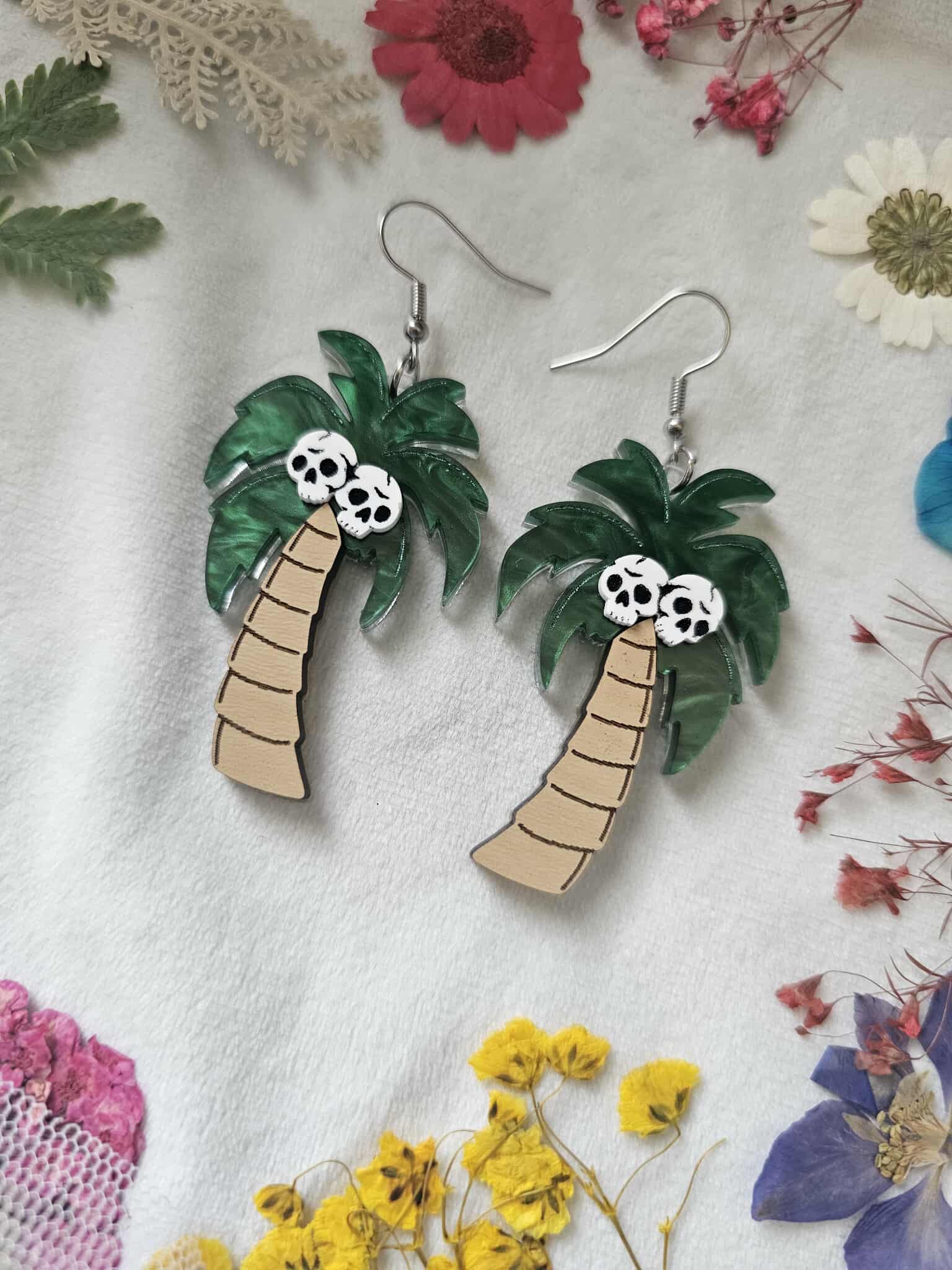 Palm trees, but make them skulls instead of coconuts! These skull palm tree earrings are made with marbled acrylics, finished wood with hand painted details.