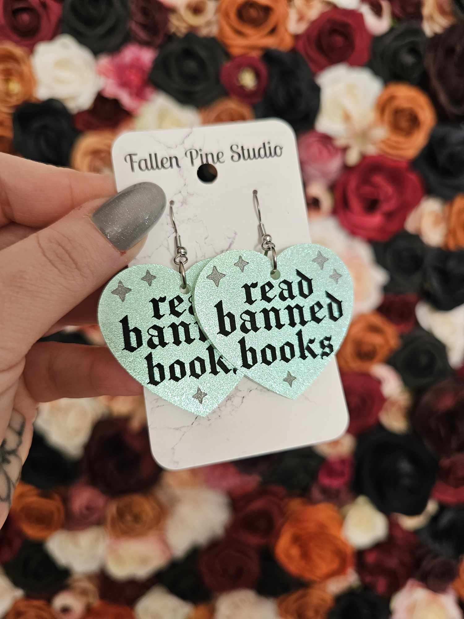 Laser engraved acrylic earring on mint shimmer acrylic with black and gold painted details.