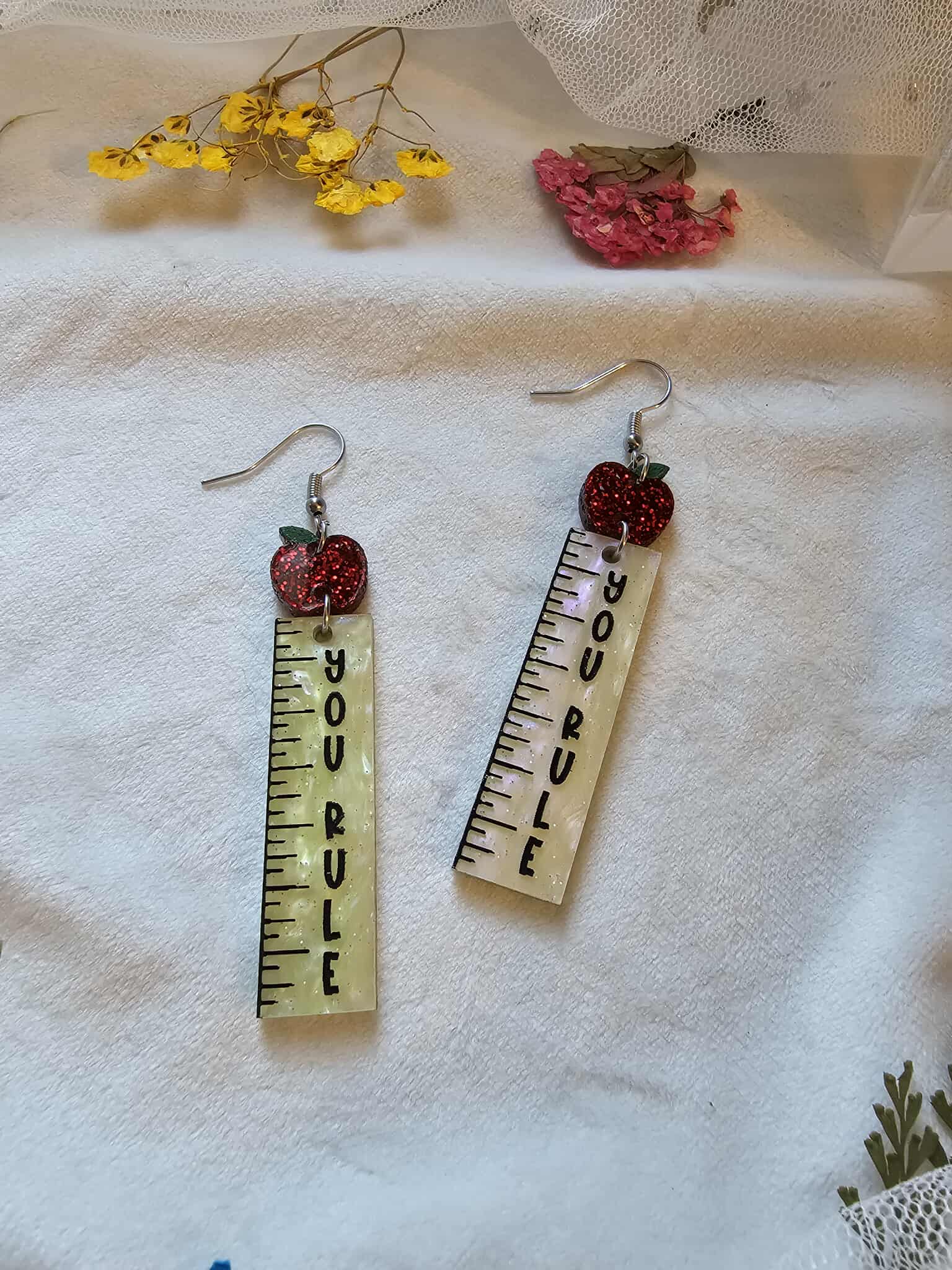 Yellow marbled acrylic with pink tones and a red glitter apple with hand painted details!