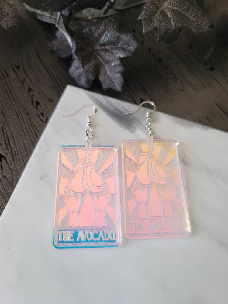 This listing is for one pair of iridescent The Avocado tarot card earrings.