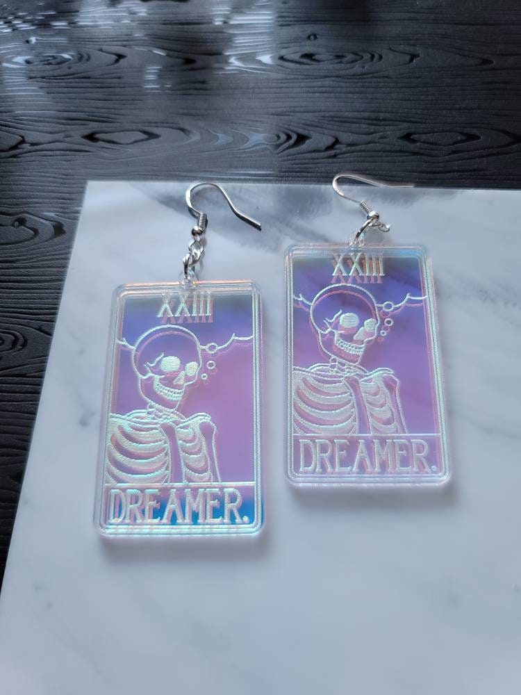 This listing is for one pair of iridescent The Dreamer tarot card earrings. The engrave shimmers in the light!